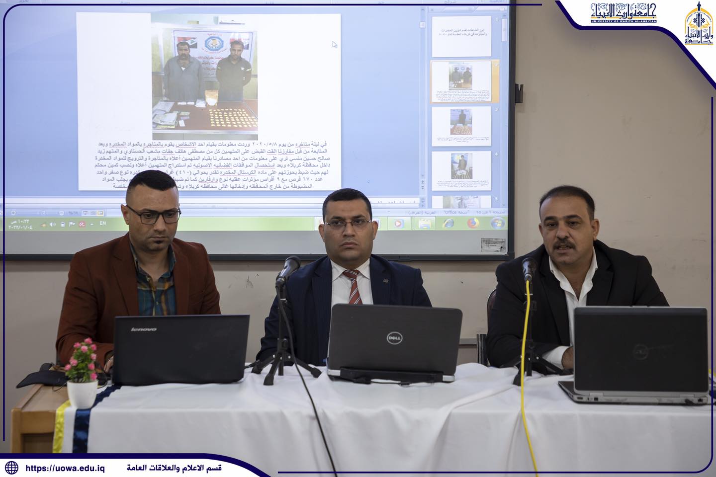 ندوة علمية عن المخدرات والرؤية القانونية / الطبية والانسانية تناولت فيها ظاهرة المخدرات وآثارها القانونية و الصحية والاجتماعية ، حيث سلطت الندوة الضوء على هذه الظاهرة السلبية واثارها على الفرد والعائلة والمجتمع ، وتناولت أيضاً أضرار المخدرات وما ينتج عنها من تأثيرات آنية ومستقبلية على الفرد والمجتمع ، إضافة الى العقوبات التي وضعها المشرِّع العراقي من قانون المخدرات والمؤثرات العقلية ، كذلك التأكيد على المسؤولية الملقاة على الجميع في مجابهة تلك الآفة الخطيرة والحد من انتشارها ، شارك بتقديم هذه الندوة العقيد الحقوقي جبار فضل سكر مدير مكافحة المخدرات في قيادة شرطة كربلاء والدكتور صباح الجبوري من كلية القانون.