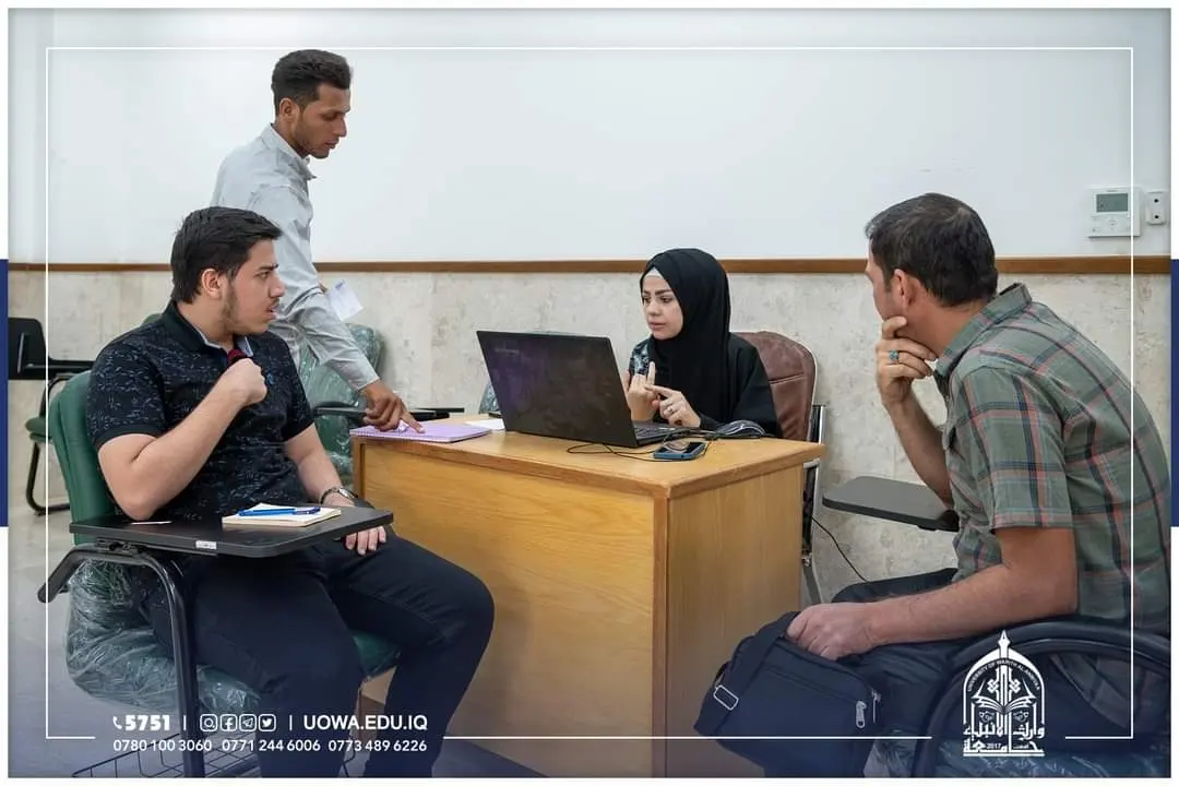 جانب من استقبال فريق التسجيل في جامعة وارث الانبياء(عليه السلام) للطلبة الاعزاء واولياء امورهم الكرام للاجابة عن استفساراتهم ومساعدتهم في انجاز اولى خطوات التقديم ،وهي انشاء حساب الطالب وملء البيانات وتفعيل القنوات الخاصة.