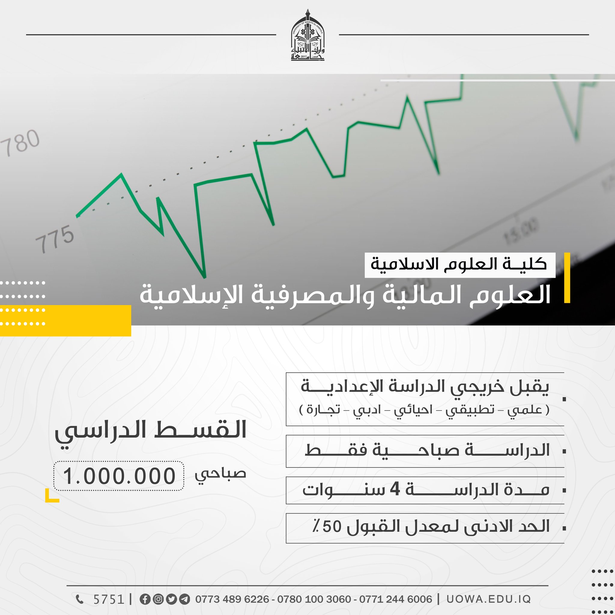 (عدا كلية الطب) اعزاءنا الطلبة الراغبين بالتسجيل في كليات واقسام جامعة وارث الانبياء(عليه السلام) (عدا كلية الطب) مراجعة الجامعة ابتداءً من السبت، إذ سيكون فريق التسجيل بانتظاركم من الساعة( ٨ ) صباحاً ولغاية( ٥ ) مساءً