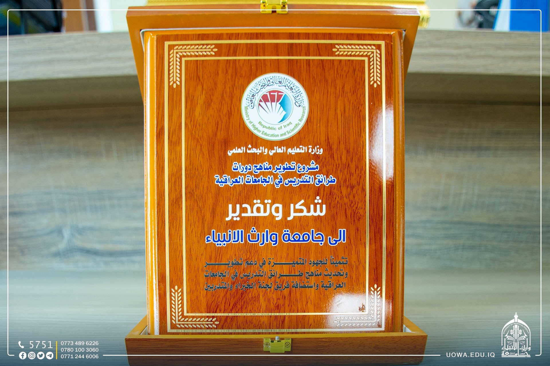 كرم معالي وزير التعليم العالي والبحث العملي الدكتور نعيم العبودي جامعة وارث الانبياء(عليه السلام) بدرع الشكر والتقدير قدمه للجامعة مستشار وزير التعليم الاستاذ الدكتور علاء عبد الحسن، تثميناً للجهود القيمة في استضافة "وفد وزارة التعليم العالي والبحث العلمي من خبراء مشروع تحديث مناهج دورات طرائق التدريس في الجامعات العراقية".