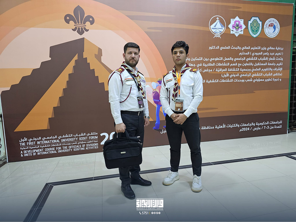 مثّل الجامعة في هذا الملتقى، الذي ضم مشاركين من 64 جامعة حكومية وأهلية، كل من المدرس الدكتور همام عبد العباس الخفاجي، رئيس قسم النشاطات الطلابية، والطالب طارق منتظر. جاءت مشاركتهم ضمن الدورة الكشفية التي أقيمت في محافظة بابل، والتي نظمها قسم النشاطات الطلابية في وزارة التعليم العالي والبحث العلمي - جهاز الإشراف والتقويم العلمي.