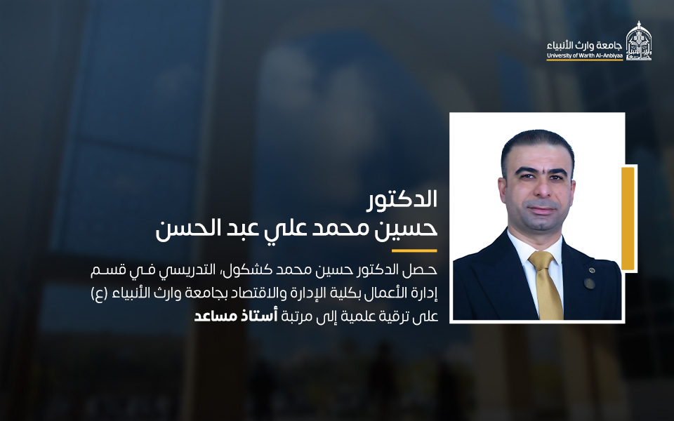 حصل الدكتور حسين محمد كشكول، التدريسي في قسم إدارة الأعمال بكلية الإدارة والاقتصاد بجامعة وارث الأنبياء (عليه السلام)، على ترقية علمية إلى مرتبة أستاذ مساعد.