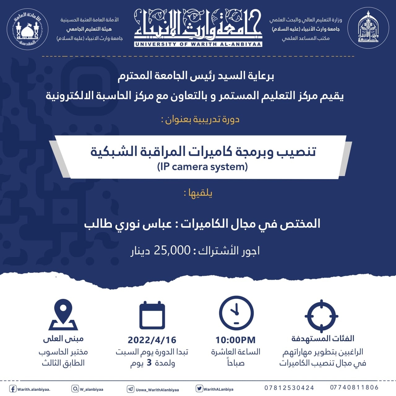 علماً أن أجور االاشتراك هي 25.000 دينار عراقي، والدورة تستمر لثلاثة أيام ابتداءً من اليوم السبت الموافق 16-4-2022.
