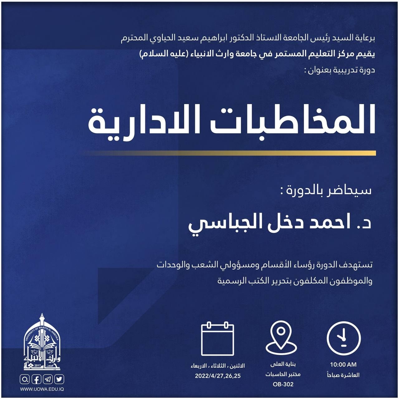يقيم مركز التعليم المستمر في جامعة وارث الأنبياء (عليه السلام) وبالتعاون مع كلية العلوم الاسلامية دورة تدريبية بعنوان (التصحيح اللغوي في المخاطبات الرسمية) والتي تعقد ابتداءً من يوم السبت الموافق 21/5/ 2022 ولمدة ثلاثة أيام، يلقي الدورة حضورياً كل من: