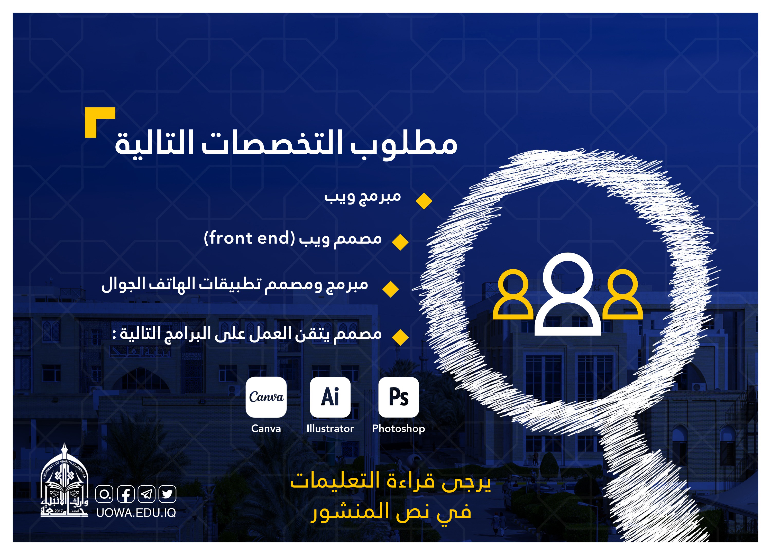 تعلن جامعة وارث الانبياء(عليه السلام) عن حاجتها الى درجات وظيفية للعمل في مركز الحاسبة الالكترونية.عند التقديم يرجى ذكر الفقرات الاتية: 1. الاسم الرباعي للمتقدم2. يعمل حالياً أو لا مع ذكر مكان العمل 3. تقديم (cv) بصيغة ملف pdf4. التخصص ونسخة من شهادة الاختصاص5. اذا كان المتقدم مختص بالتصميم يتم وضع روابط اعماله الموجودة على (behance, canvas, figma ) أو ارفاق مجموعة من تصاميمه على شكل صور.6. إذا كان المتقدم مختص بالبرمجة عليه وضع رابط( linkedin و github )وفي حال عدم توفرها، عليه ارسال روابط أعماله سواء كانت مواقع أو تطبيقاتعلى الراغب بالتقديم مراسلة بريد مركز الحاسبة الالكترونية في الجامعة [email protected]