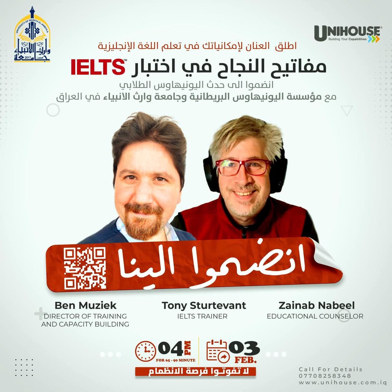 تقدم جامعة وارث الأنبياء، وبالتعاون مع مؤسسة UniHouse البريطانية، برامج تدريبية متخصصة للتحضير لإمتحان IELTS. يتم تدريس هذه البرامج من قبل مدربين محترفين وعالميين معتمدين IELTS الدولية.