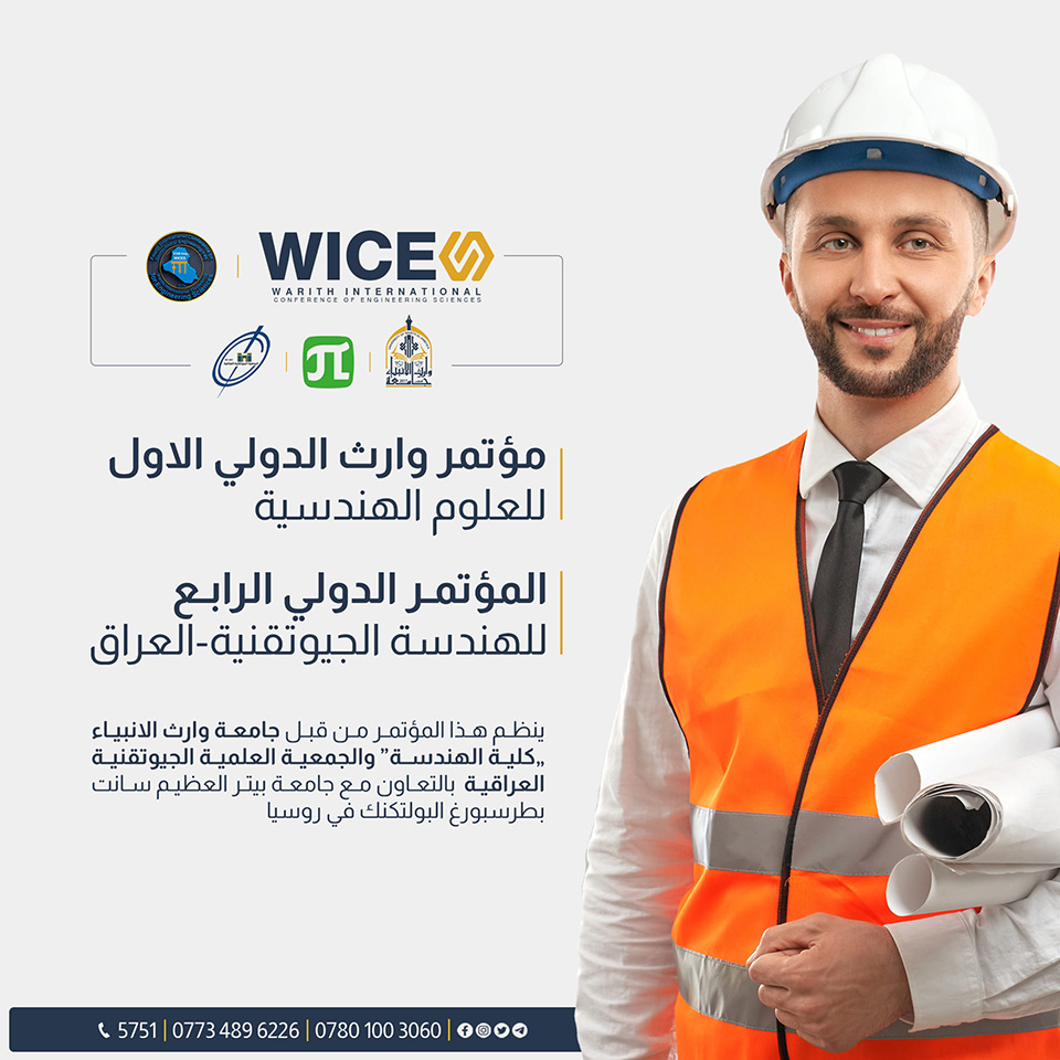 تدعو كلية الهندسة في جامعة وارث الأنبياء (عليه السلام) الأكاديميين، والباحثين في الجامعات والمراكز البحثية، والجمعيات العلمية المحلية والدولية للمشاركة في "المؤتمر الدولي الأول للعلوم الهندسية". يُقام المؤتمر بالتعاون مع الجمعية العلمية الجيوتقنية العراقية وجامعة Saint Petersburg Polytechnic في روسيا.