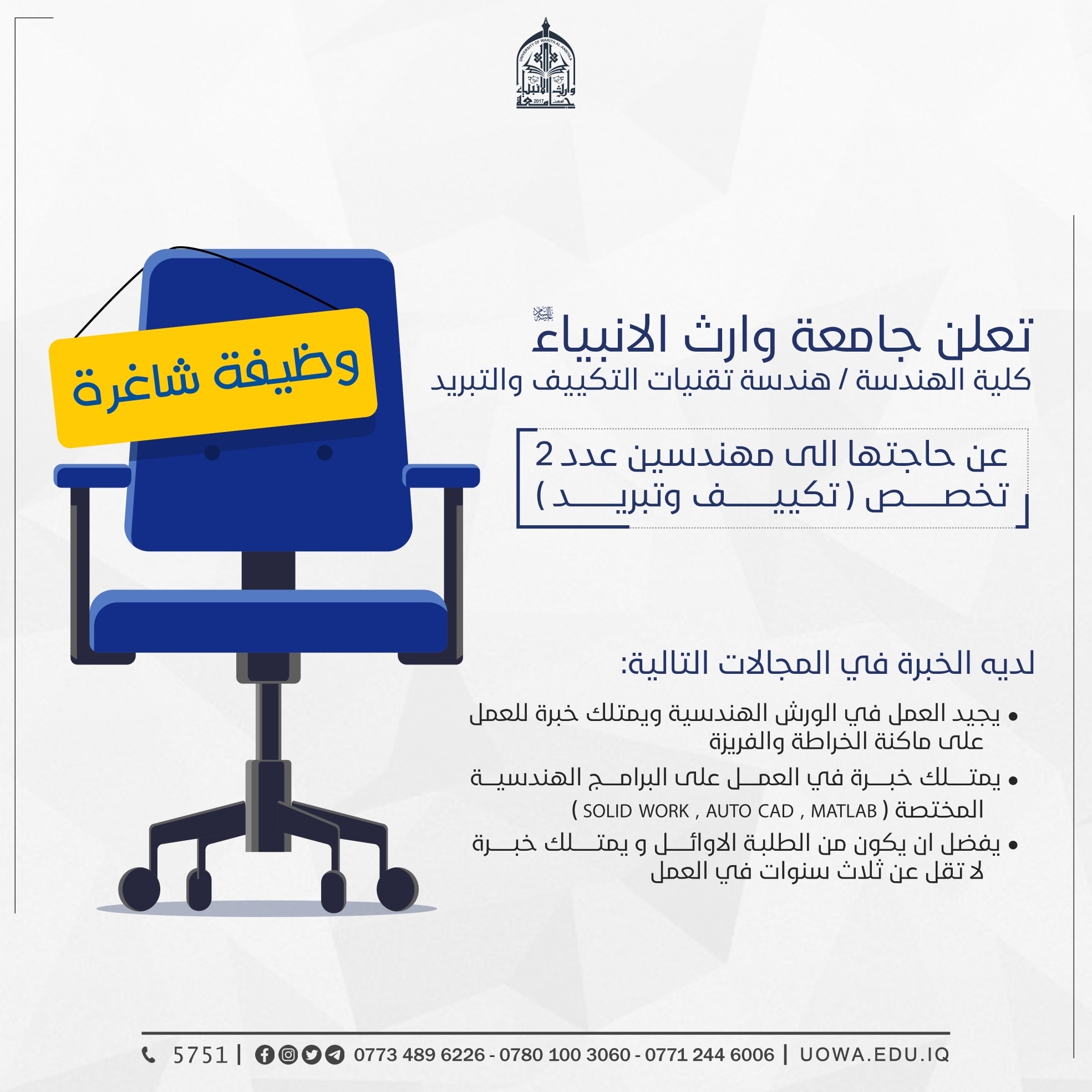 تعلن جامعة وارث الانبياء (عليه السلام) / كلية الهندسة / قسم هندسة تقنيات التكييف والتبريد