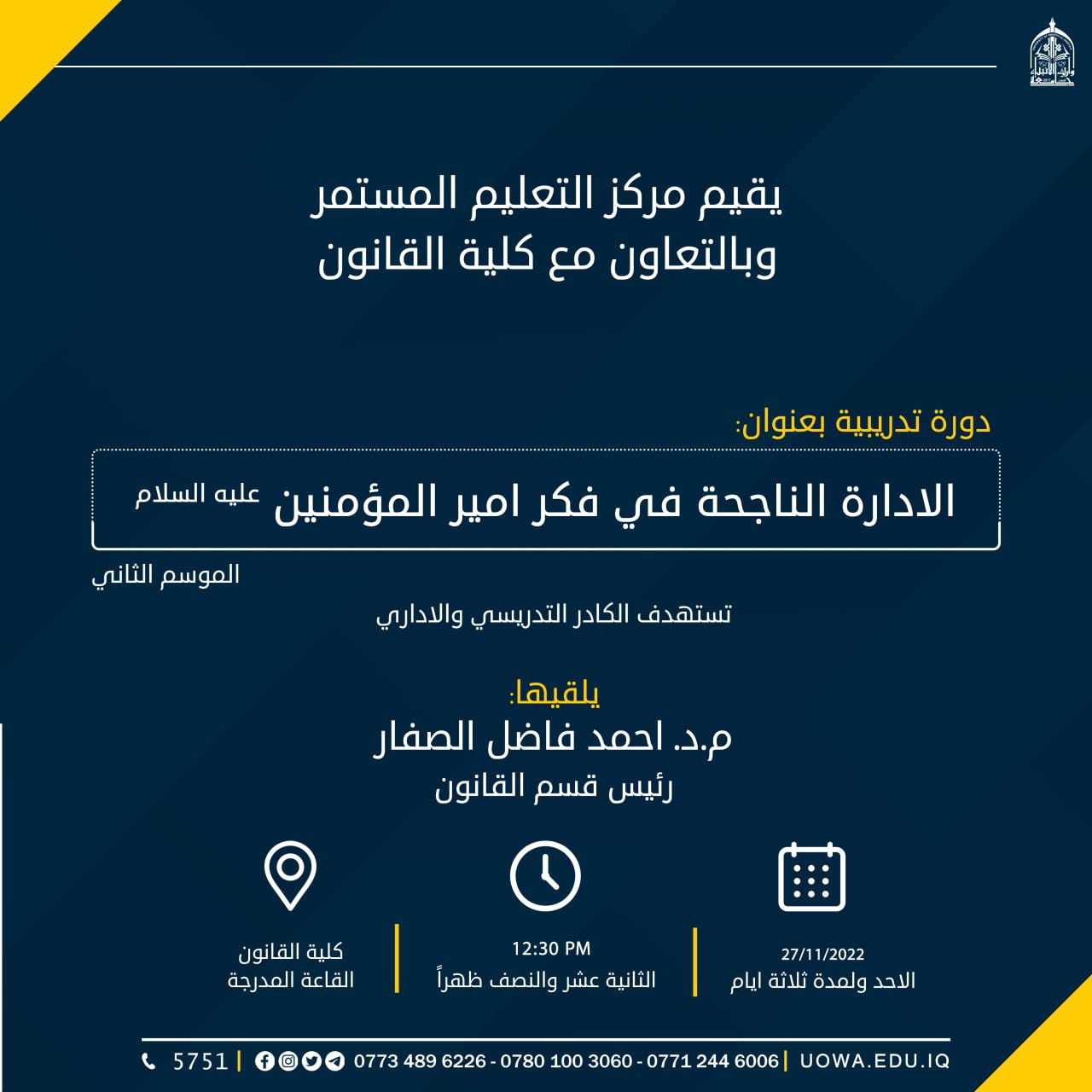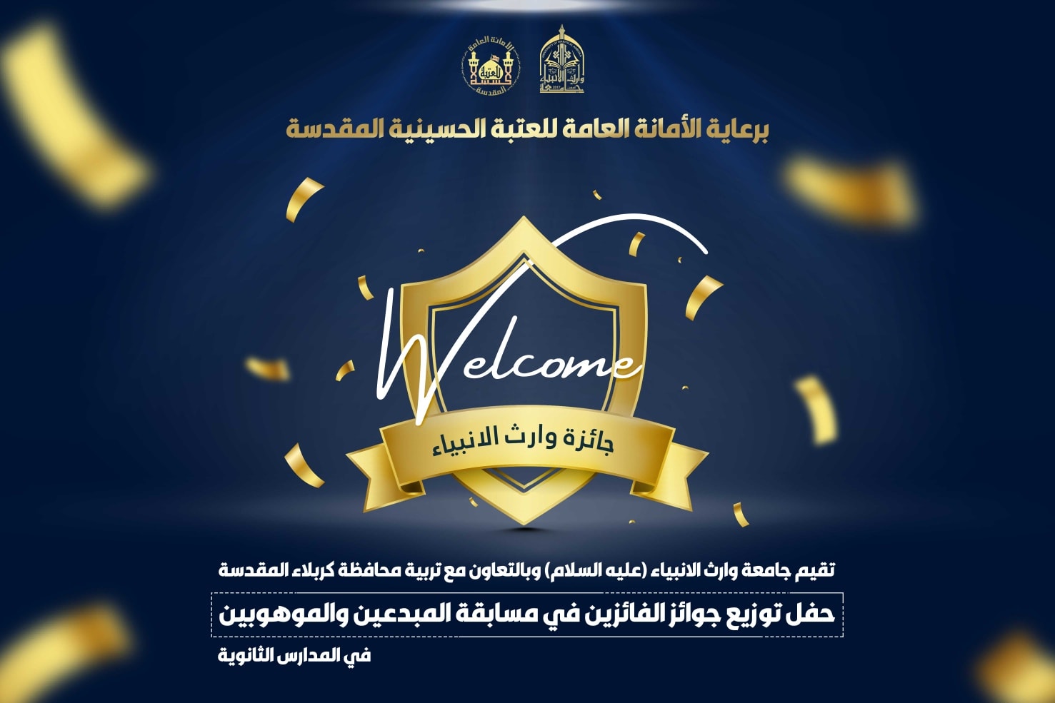 في رحاب جامعة وارث الانبياء(علبه السلام)، ننتظركم اليوم الاربعاء الموافق 23\11\2022 في حفل توزيع جوائز الفائزين بمسابقة وارث الانبياء للمبدعين والموهوبين في المدارس الثانوية في تمام الساعة ال10صباحاً