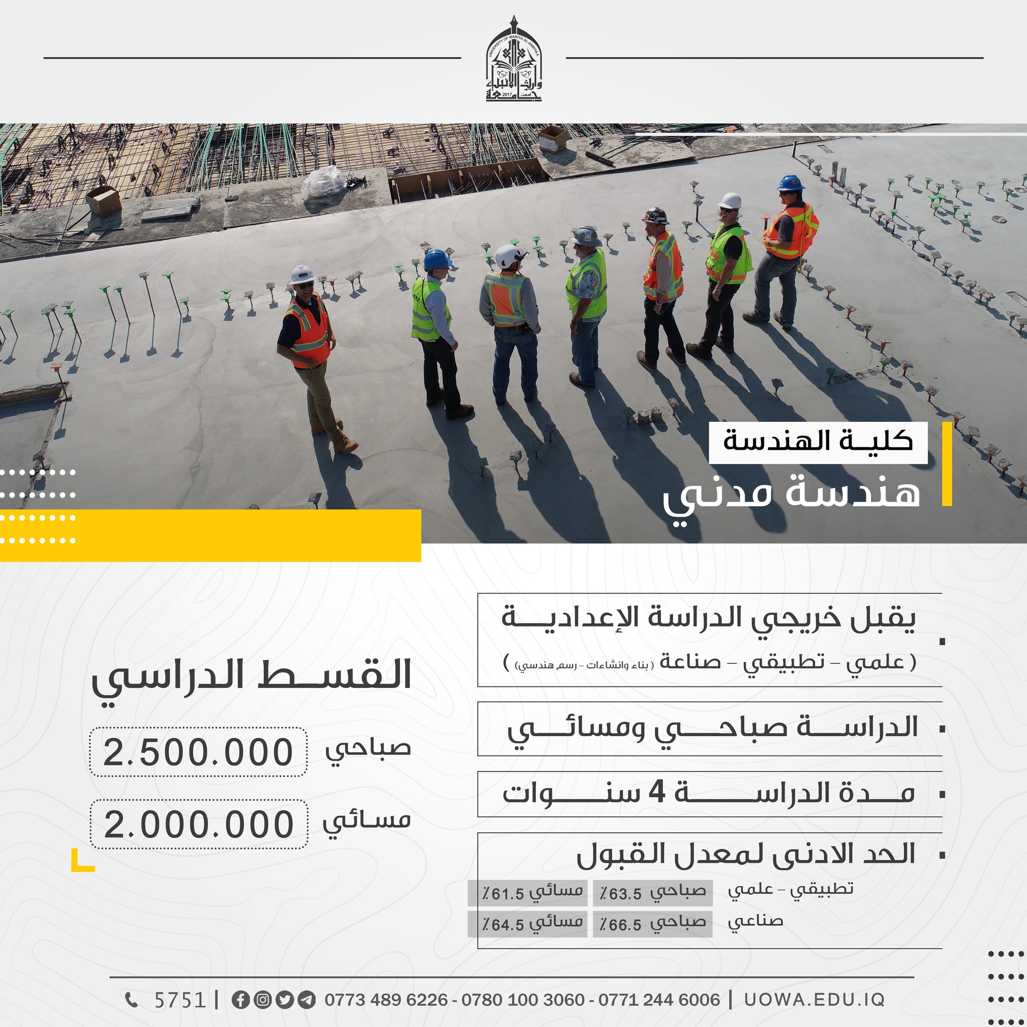*علما ان فريق التسجيل متواجد طيلة ايام الاسبوع(عدا يوم الجمعة) من الساعة ٨صباحاً ولغاية ٥مساء لاستقيالكم ومساعدتكم في اتمام عملية التقديم.