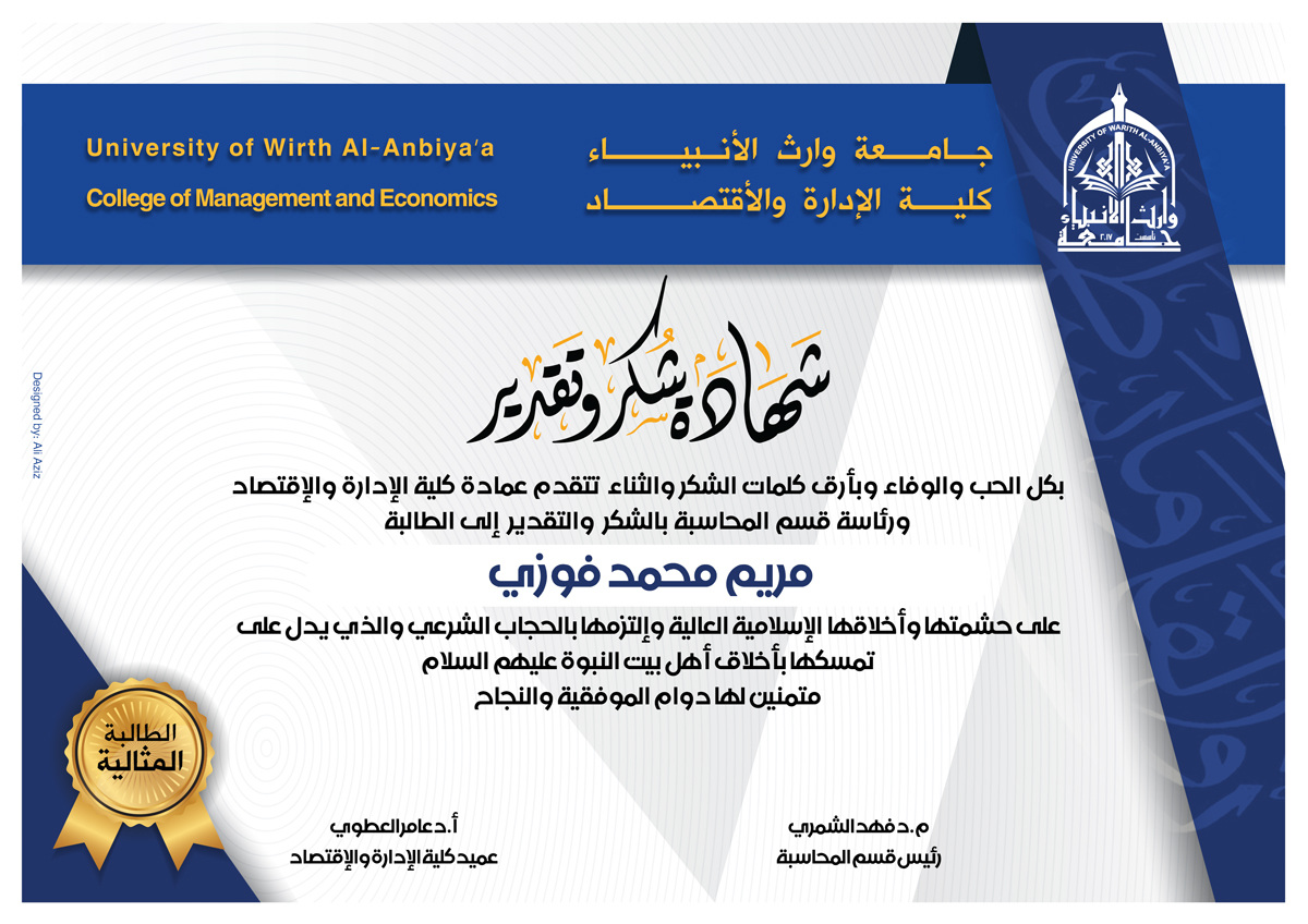 حصلت كلية الادارة والاقتصاد على كتاب شكر وتقدير من قبل أ.د عباس الدعمي المساعد العلمي لرئيس جامعة الوارث الانبياء لتحقيق الكلية المركز الاول بين كليات الجامعة في مجال ادارة الموقع الالكتروني