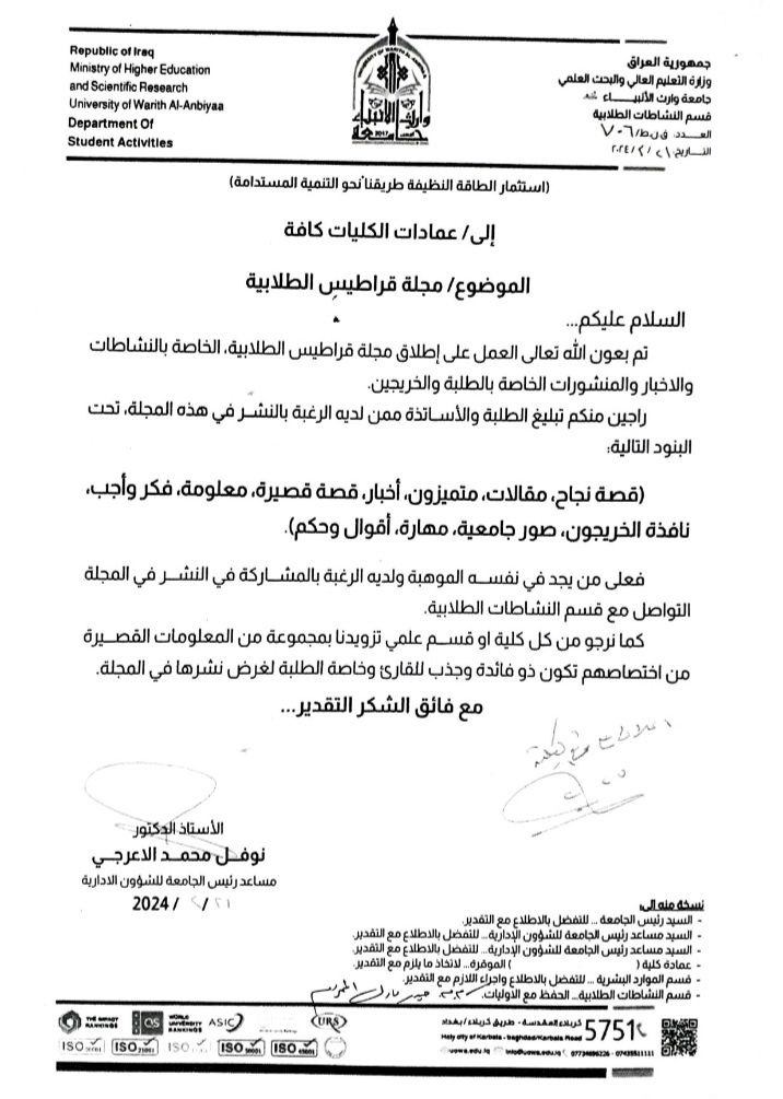 تم بعون الله تعالى العمل على اطلاق مجلة قراطيس الطلابية ، الخاصة بالنشاطات والاخبار والمنشورات الخاصة بالطلبة والخريجين على الطلبة والاساتذه ممن لديه الرغبة بالنشر في هذه المجلة تحت البنود التالية : ( قصة نجاح ، مقالات ، متميزون ، أخبار ، قصة قصيرة ، معلومة ، فكر واجب ، نافذة الخريجون ، صور جامعية ، مهارة ، اقوال وحكم ) فعلى من يجد نفسه الموهبة ولديه الرغبة بالمشاركة في النشر في المجلة التواصل مع قسم النشاطات الطلابية