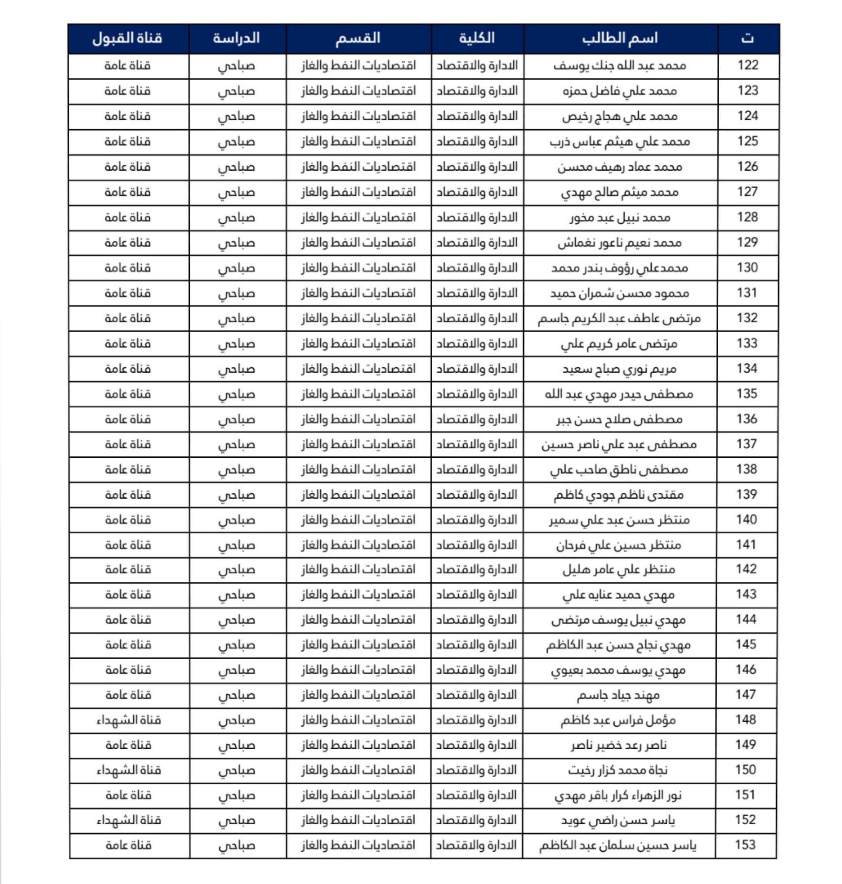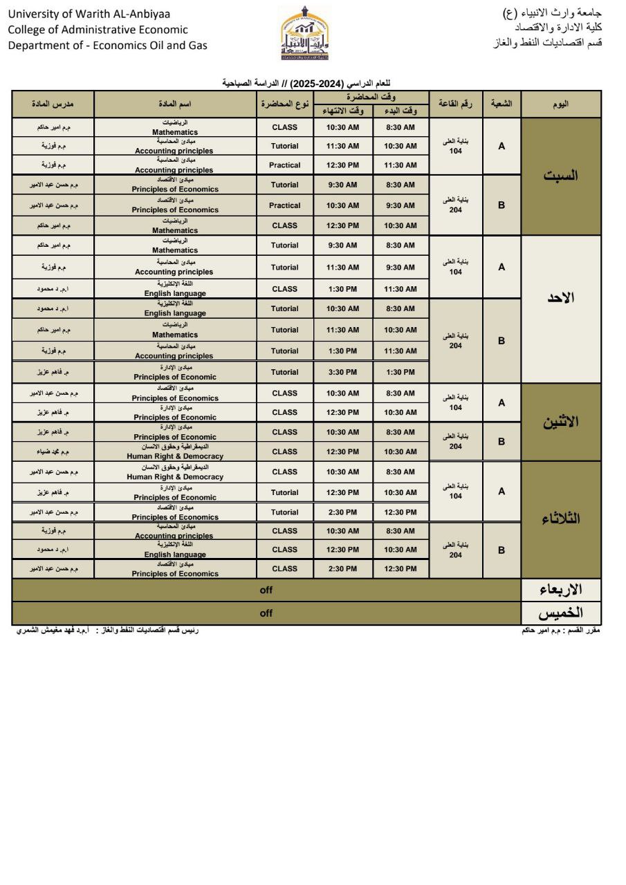 جدول كلية الإدارة والاقتصاد قسم اقتصاديات النفط والغاز للمرحلة الأولى 2024-2025