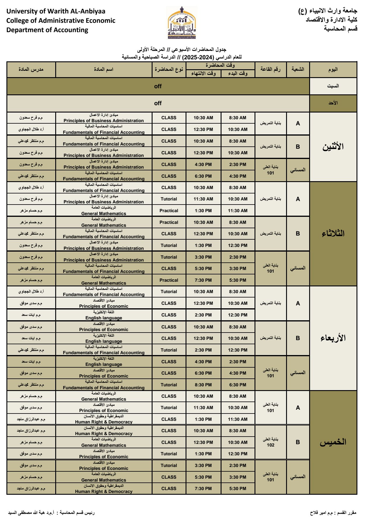 جدول كلية الإدارة والاقتصاد الاسبوعي قسم المحاسبة للمرحلة الأولى 2024-2025