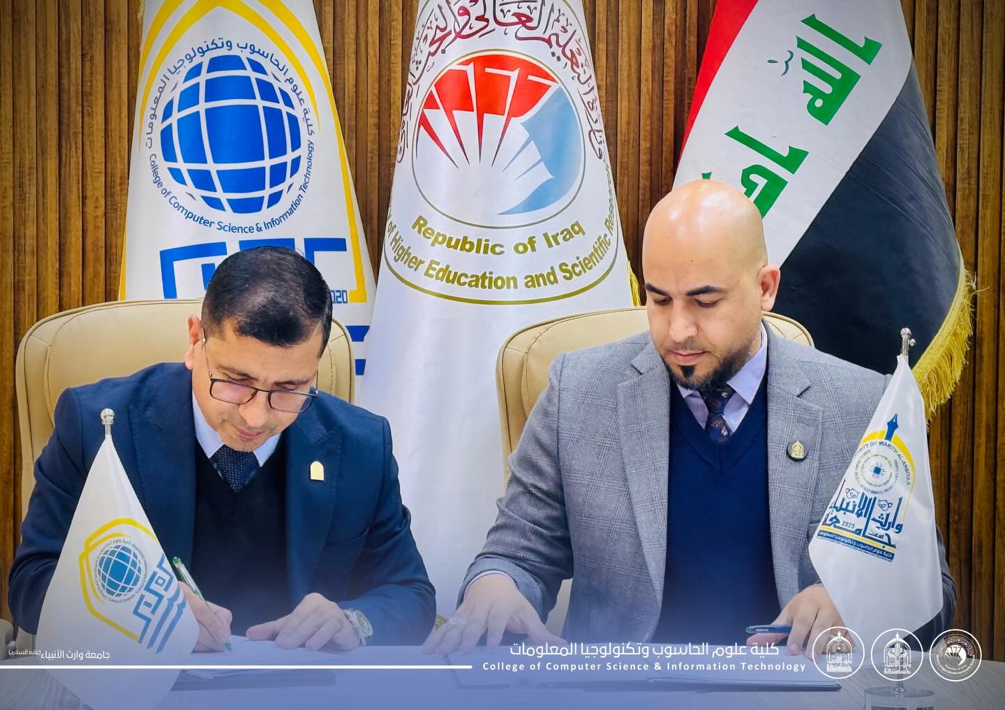 وقّع الأستاذ المساعد الدكتور حيدر محمد علي الغانمي، عميد كلية علوم الحاسوب وتكنولوجيا المعلومات بجامعة وارث الانبياء عليه السلام، اتفاقية توأمة علمية مع الأستاذ المساعد الدكتور موفق كاظم الحسناوي، عميد كلية علوم الحاسوب وتكنولوجيا المعلومات في جامعة كربلاء.