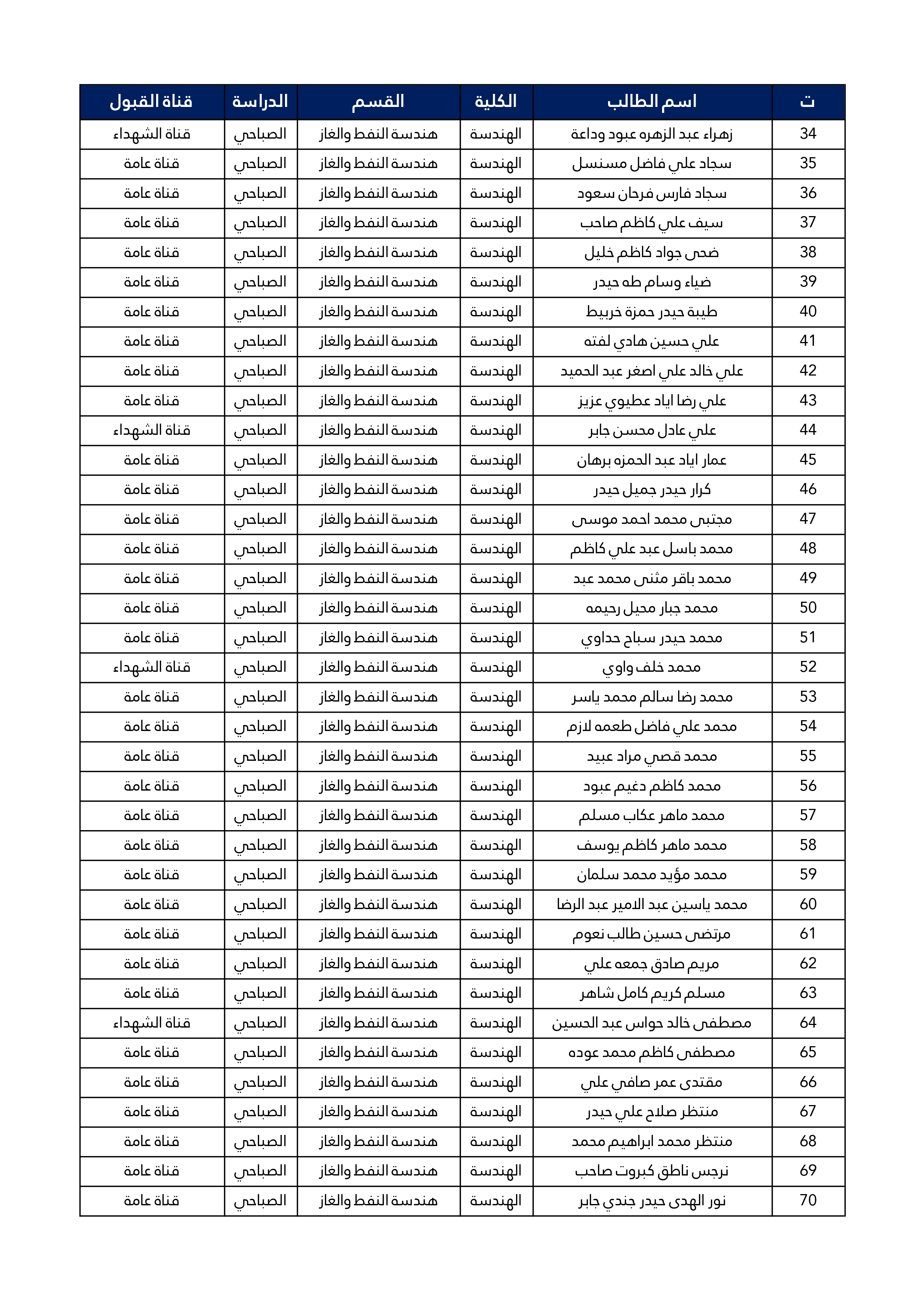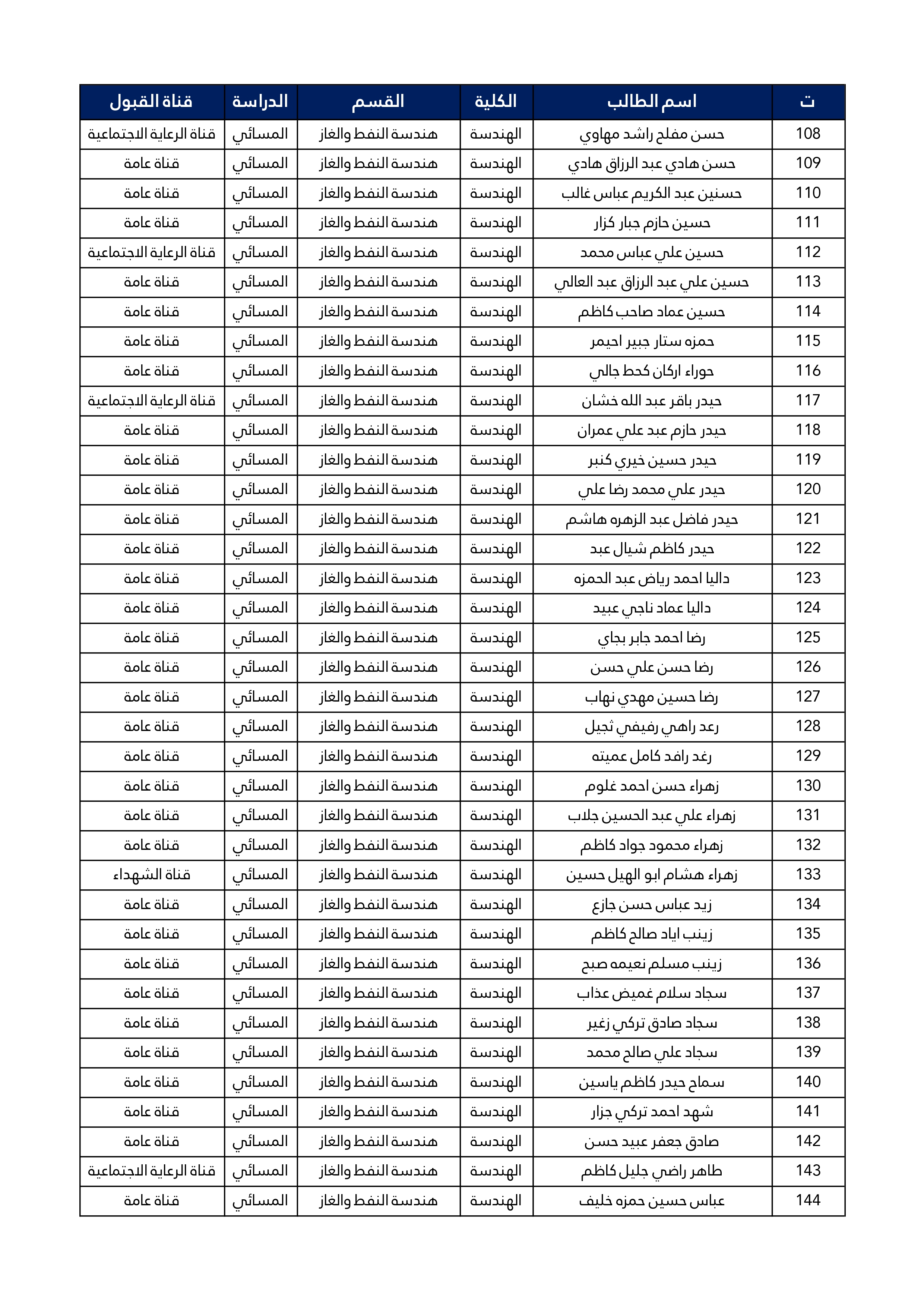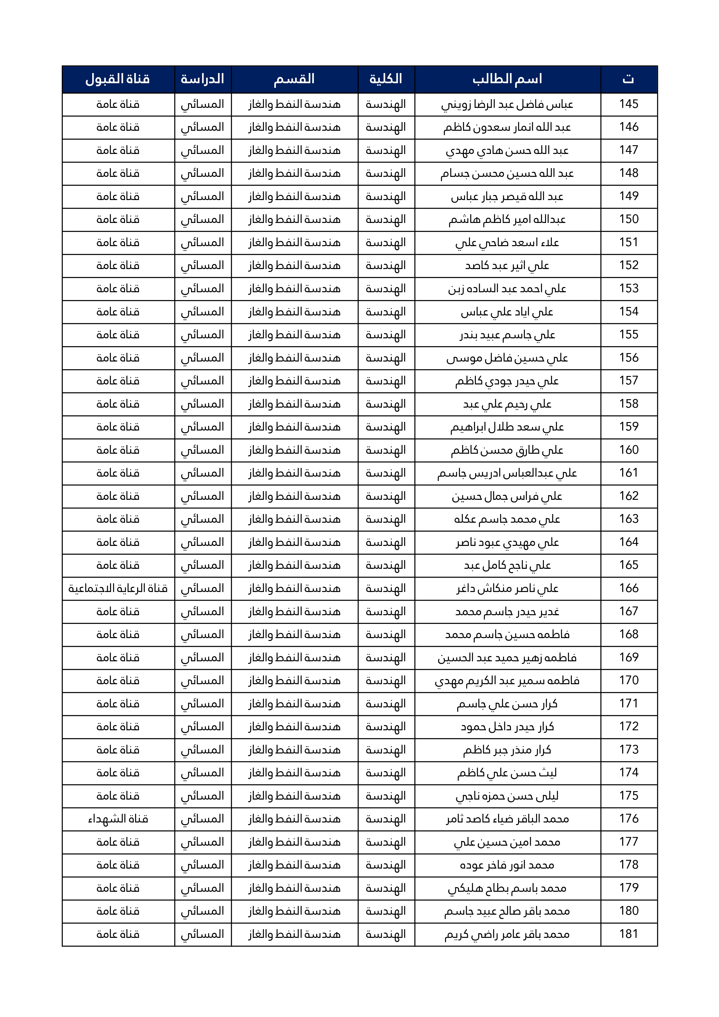اسماء الطلبة المقبولين في قسم هندسة النفط و الغاز للعام الدراسي 2025/2024 للدراستين الصباحية و المسائية
