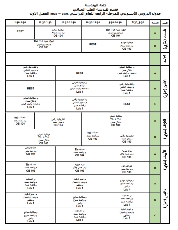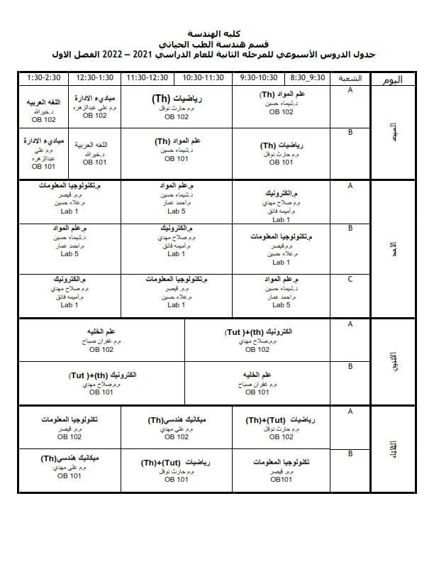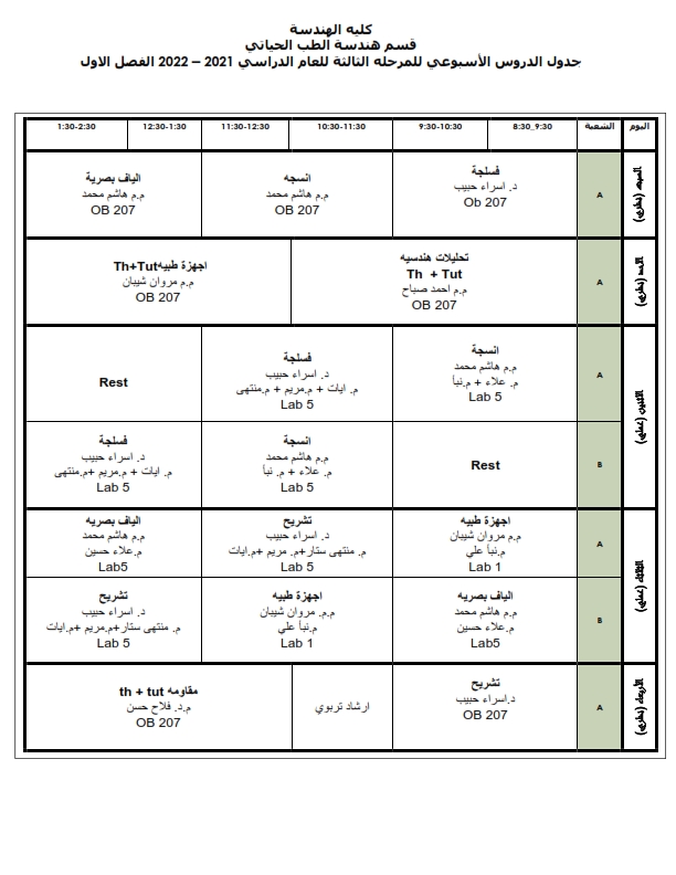 جدول الدروس الاسبوعي لطلبة قسم هندسة الطب الحياتي