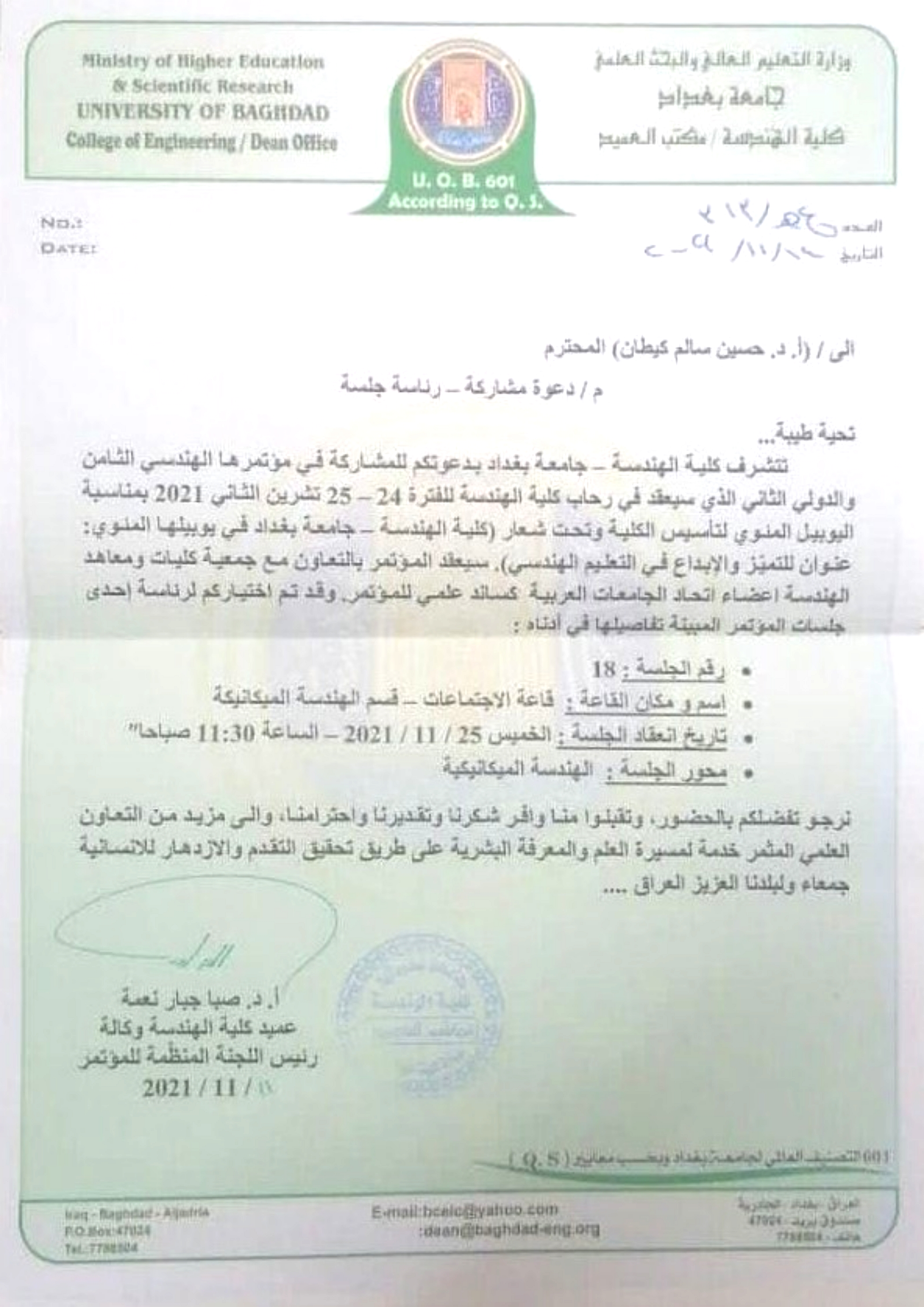 شارك السيد رئيس قسم هندسة الطب الحياتي في كلية الهندسة جامعة وارث الأنبياء في المؤتمر الهندسي الثامن والدولي الثاني لجامعة بغداد كليه الهندسة رئيساً لأحدى جلسات المؤتمر حيث عقد المؤتمر في رحاب كلية الهندسة جامعة بغداد للفترة 24-25 تشرين الثاني 2021.