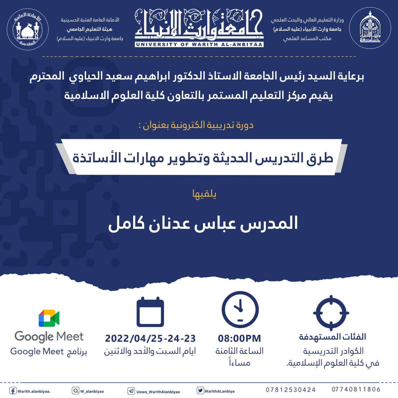 برعاية السيد رئيس الجامعة المحترم يقيم قسم التعليم المستمر بالتعاون مع كلية العلوم الإسلامية في جامعة وارث الانبياء دورة تدريبية حول شروط وضوابط الترقيات العلمية تقدمها أ.م.د. نور مهدي الساعدي