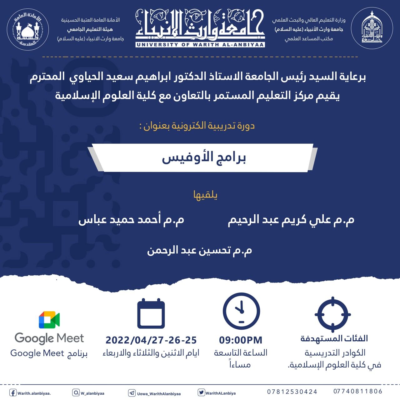 وبحضور ومتابعة السيد عميد كلية العلوم الاسلامية أ.م.د طلال الكمالي المحترم قدم كل من المدرب الاستاذ ليث السيلاوي والمدرب السيد علي الهاشمي دورتهما ضمن متطلبات البرنامج الذي تقيمه الاكاديمية في تاهيل وتمكين طلبة الجامعات لسوق العمل.