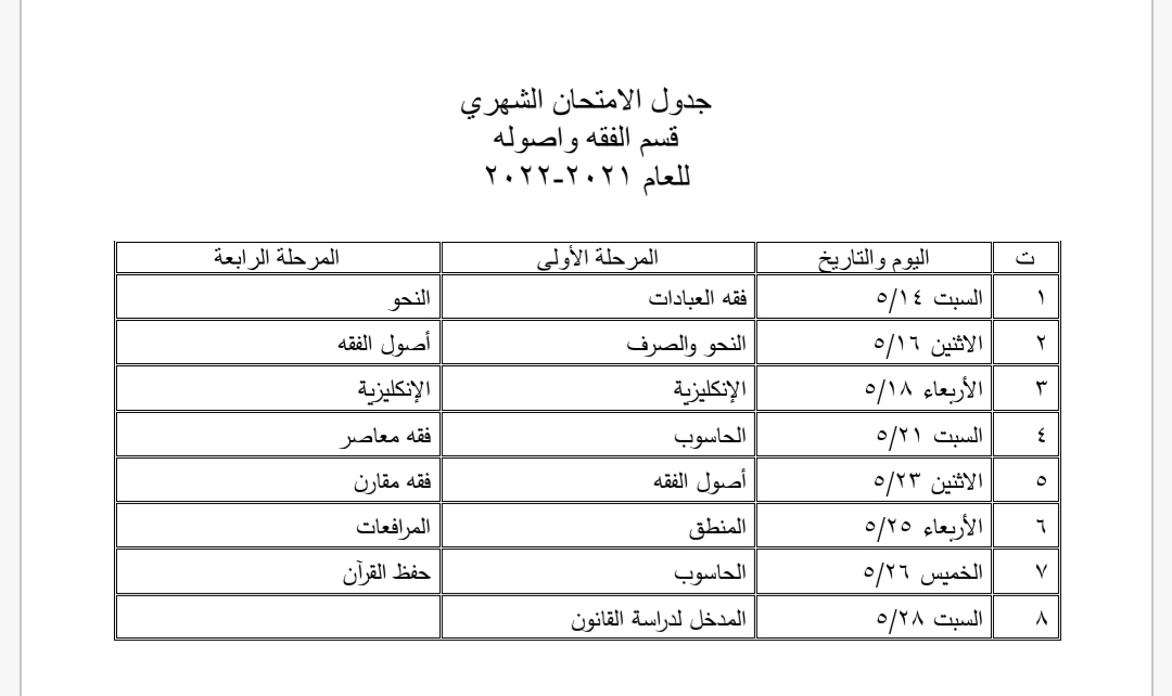اعلن قسم الفقه وأصوله في كلية العلوم الإسلامية في جامعة وارث الانبياء وضمن استعداده لإجراء الامتحانات الشهرية للفصل الدراسي الثاني للعام الدراسي الثاني 2022 جدول الامتحانات الشهرية