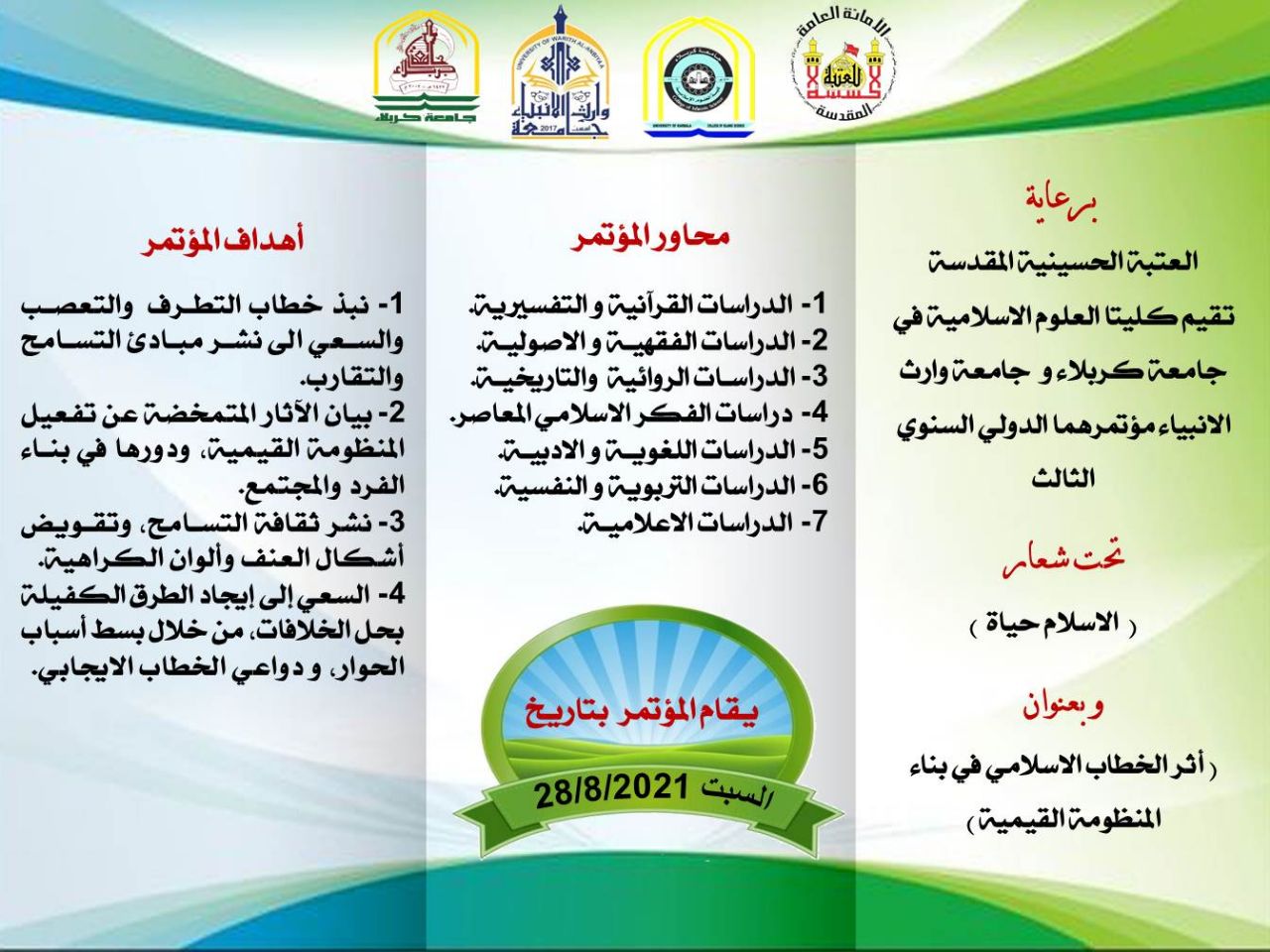 تقيم كلية العلوم الإسلامية في جامعة وارث الانبياء التابعة للعتبة الحسينية المقدسة مؤتمرها العلمي تحت شعار الإسلام حياة والموسوم ب( اثر الخطاب الاسلامي في بناء المنظومة القيمية )