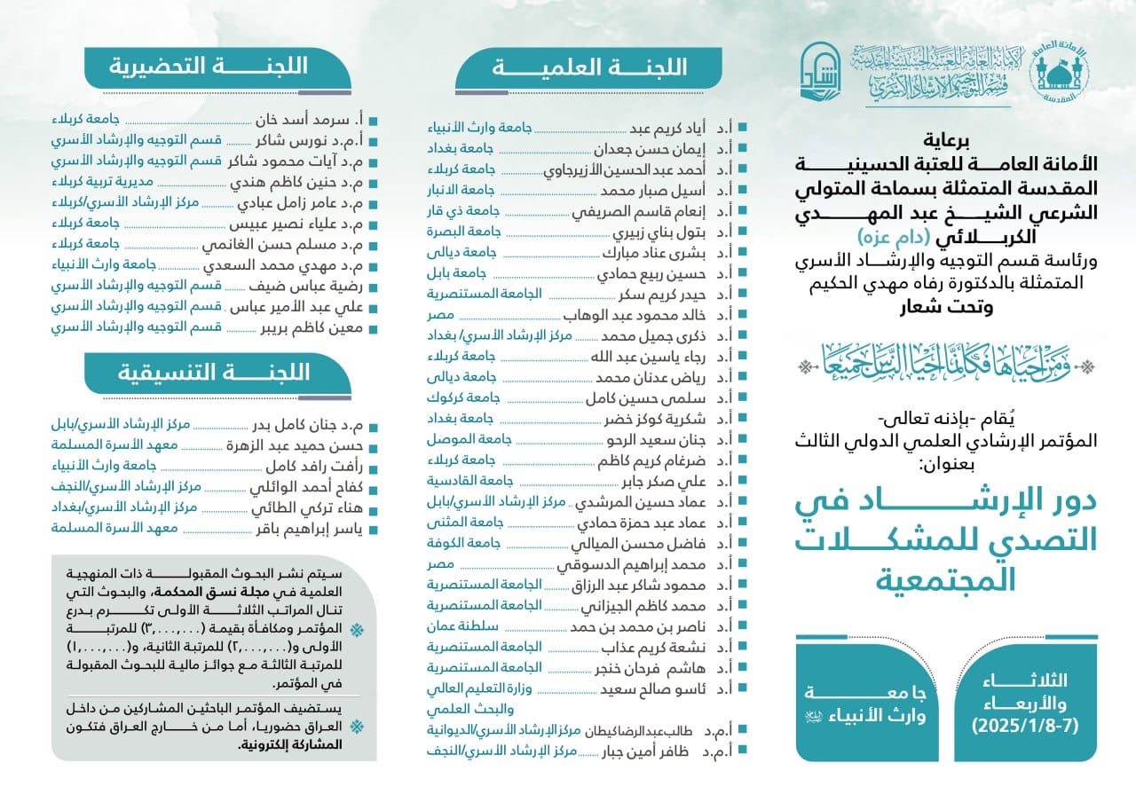 برعاية ومُباركة الأمانة العامّة للعتبة الحسينيّة المقدّسة، وتحت إشراف سماحة المتولّي الشرعيّ الشيخ عبد المهديّ الكربلائيّ (دام عزّه)، يُعلن قسم التوجيه والإرشاد الأسريّ عن إقامة مؤتمره الإرشاديّ العلميّ الدوليّ الثالث بعنوان: