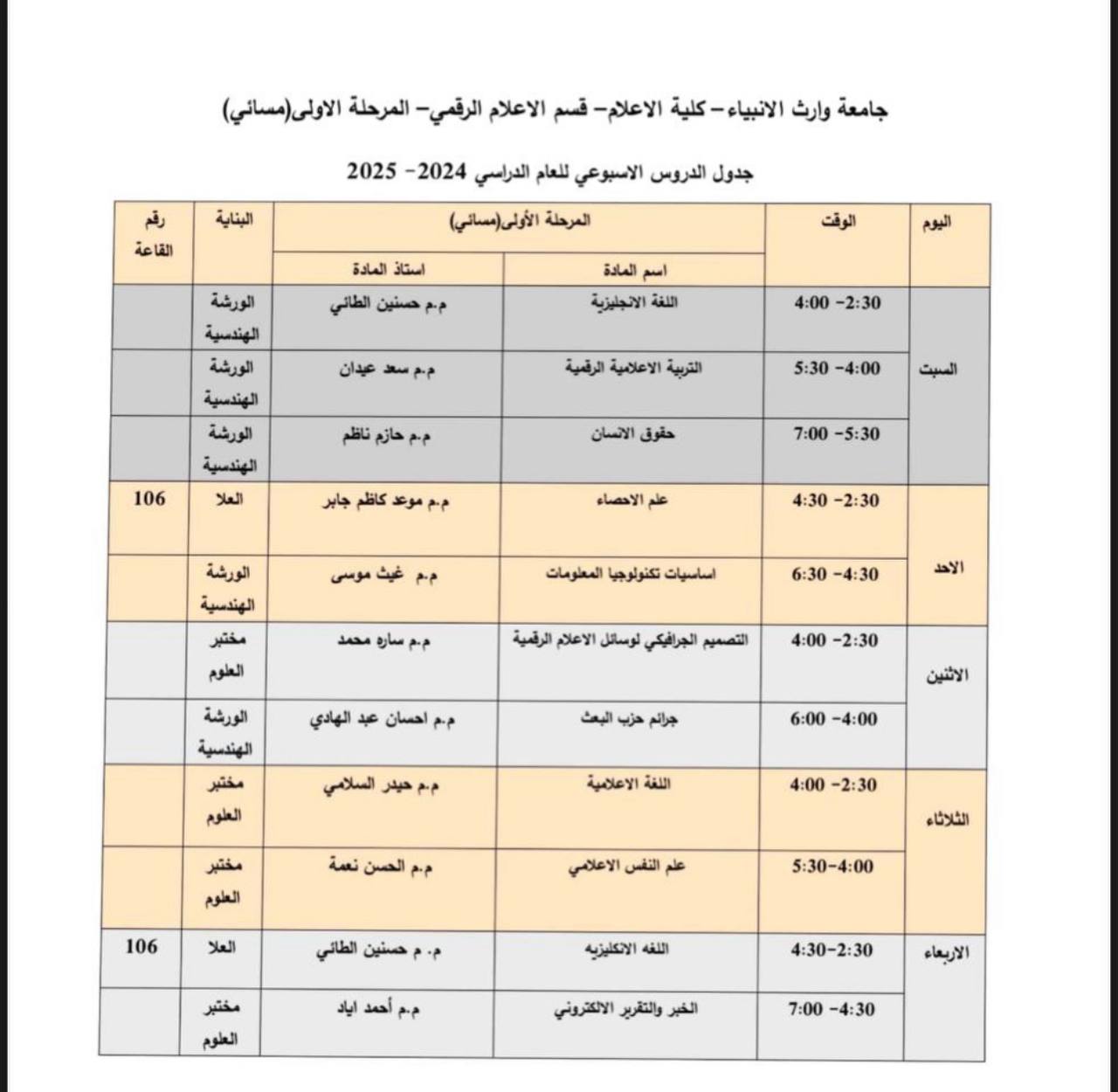 اعلان الجدول الاسبوع للدراسة المسائية للمرحلة الاولى كلية الاعلام قسم الاعلام الرقمي