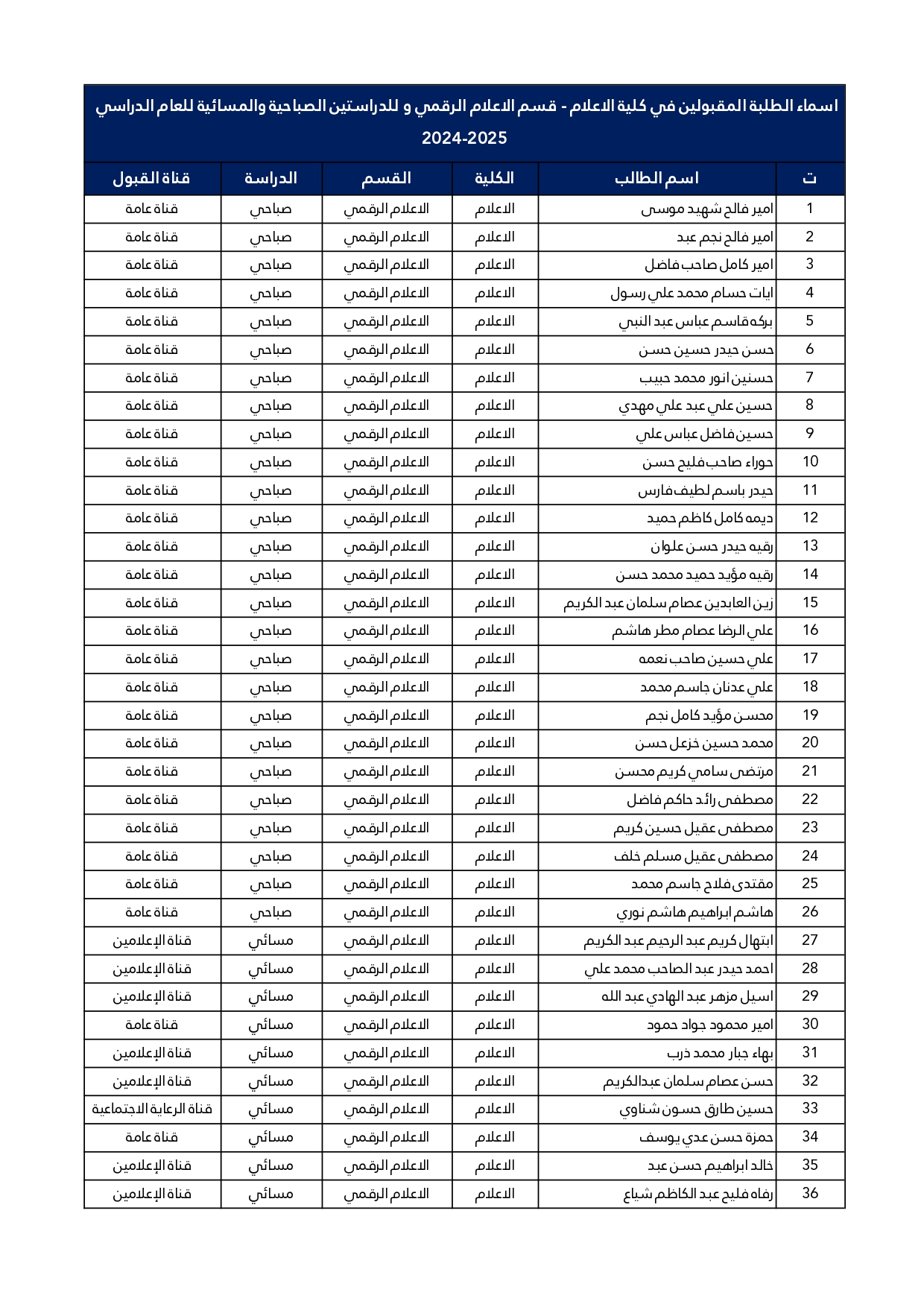 اسماء الطلبة المقبولين للدراسة الصباحية والمسائية للمرحلة الاولى كلية الاعلام قسم الاعلام الرقمي