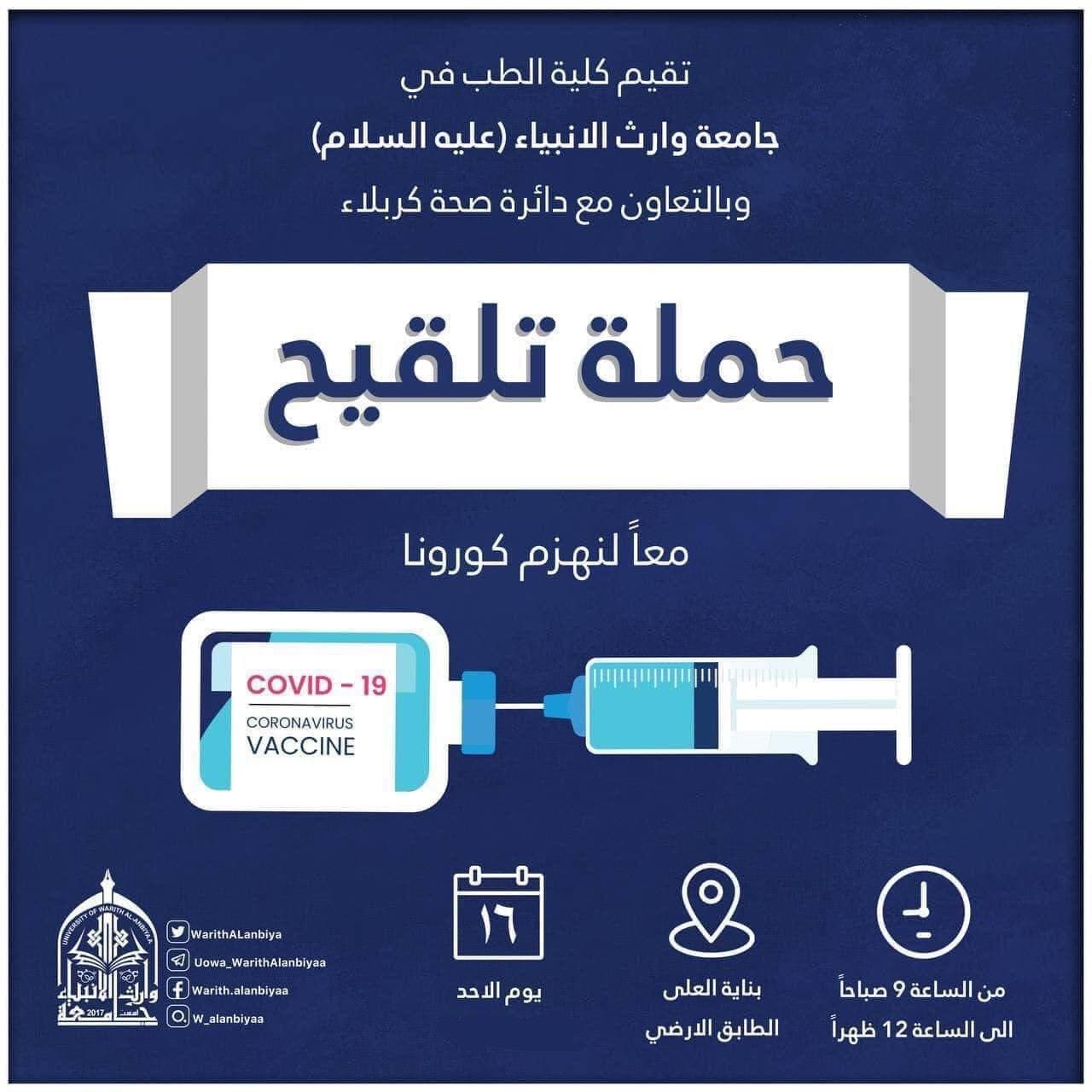 تستمر حملة التلقيح التي تقيمها كلية الطب وبالتعاون مع دائرة صحة كربلاء المقدسة كل يوم احد  ،للحد من إنتشار فايروس كورونا .