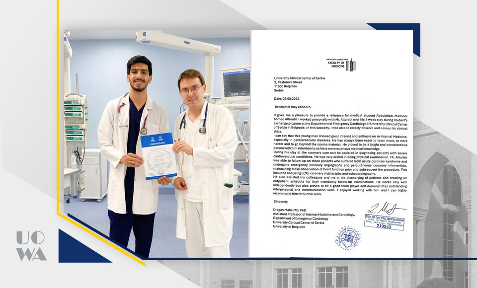 أكمل أحد طلبة كلية الطب في جامعة وارث الأنبياء بنجاح فترة تدريب طبي لمدة شهر في جامعة المركز السريري الصربي بلغراد، صربيا وذلك ضمن برنامج التبادل الدولي التابع لجمعية طلبة الطب العراقية (IFMSA).