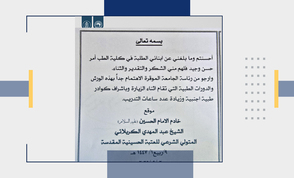 إن هذا الاهتمام الكبير والدعم المستمر من المرجعية الدينية العليا ممثلة بسماحته هو دافع معنوي وعلمي ثمين يعزز إصرارنا على تقديم تعليم طبي متطور يواكب المستجدات العالمية ويسهم في إعداد أطباء على قدر عال من الكفاءة العلمية والمهارية