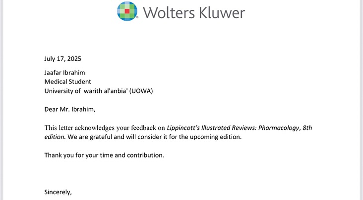كرّم السيد عميد كلية الطب في جامعة وارث الأنبياء (ع) الأستاذ الدكتور علي عبد سعدون الغزي الطالب جعفر إبراهيم دخيل مطر ، ومنحه كتاب شكر وتقدير من السيد رئيس الجامعة الأستاذ الدكتور إبراهيم سعيد الحياوي إضافةً إلى مكافأة مالية تقديراً لجهوده العلمية المتميزة.وجاء هذا التكريم بعد أن وجّه الطالب رسالة رسمية إلى دار النشر العالمية (Wolters Kluwer) بخصوص ملاحظة علمية دقيقة في كتاب‏Lippincott’s Illustrated Reviews: Pharmacology – 8th Edition،تتعلق بتوصيف أدوية MAOIs في الصفحتين (141 و185).وقد تم قبول الملاحظة والاعتراف بصحتها من قبل الجهة الناشرةوهو إنجاز علمي متميز يعكس كفاءة طلبة كلية الطب في جامعة وارث الأنبياء (ع) وحرصهم على الدقة والتميز الأكاديمي