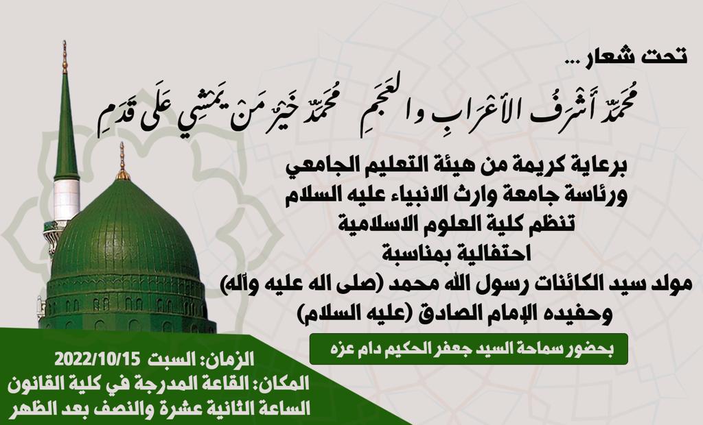 برعاية كريمة من هيئة التعليم الجامعي ورئاسة جامعة وارث الانبياء عليه السلام تنظم كلية العلوم الاسلامية مهرجاناً دينياً بمناسبة مولد سيد الكائنات رسول الله محمد (صلى اله عليه وآله) وحفيده الإمام الصادق (عليه السلام)