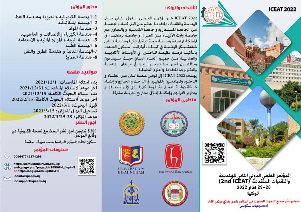 لمعرفة آخر ما توصل إليه الباحثون في ميدان الهندسة والتكنولوجيا المتقدمة والعلوم التطبيقية من جميع أنحاء العالم تعقد كلية الهندسة في الجامعة المستنصرية، وبالتعاون مع جامعة وارث الانبياء، جامعة برمنكهام البريطانية، جامعة كييف الوطنية الاوكرانية وجامعة حجة تبه التركية مؤتمرها الدولي العلمي للهندسة والتقنيات المتقدمةICEAT2022 والذي سيقام افتراضياً يوم الاثنين 28/3/2022، ويستمر ليومينبمشاركة العديد من الدول الاجنبية حيث أن جميع البحوث ستنشر في المستوعبات العالميةرابط الجلسة الافتتاحيةhttps://zoom.us/j/8922257718...