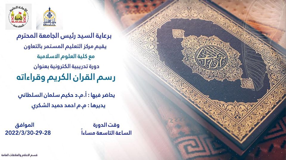 نود اعلامكم عن إقامة دورة تدريبية بعنوان (رسم القرآن الكريم وقراءاته)
