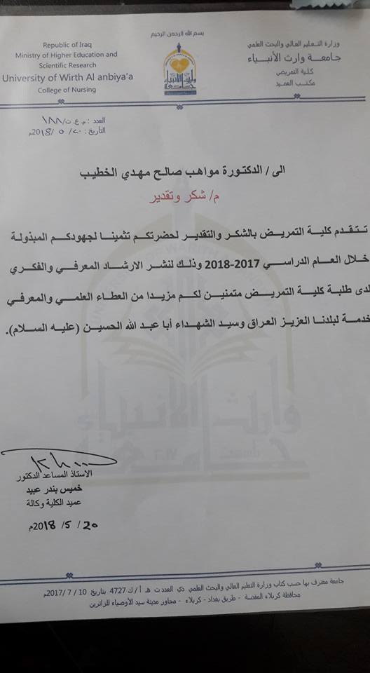 وجه الاستاذ الدكتور طالب حسن موسى  /رئيس جامعة وارث الانبياء كتاب شكر وتقدير الى الأستاذ المساعد الدكتور خميس بندر عبيد السعيدي /عميد كلية التمريض/جامعة وارث الانبياء  وذلك لنشرة بحثين علميين في مجلة عالمية ويعد هذا العمل حلقة انجاز تضاف الى انجازات الكلية والجامعة على الصعيد العالمي في نشر البحوث.