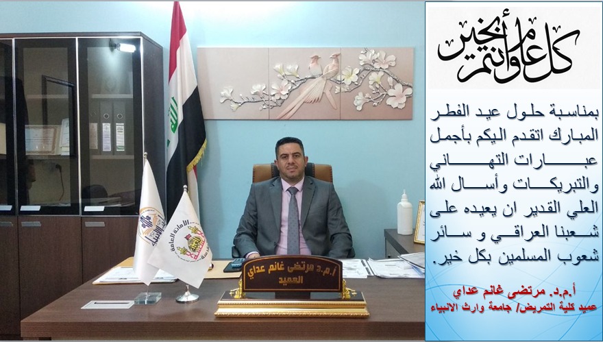 تتقدم كلية التمريض في جامعة وارث الانبياء بأحر التهاني واصدق التبريكات الى الأمة الاسلامية والعراقيين عامة و إلى اعضاء الهيئة التدريسيية والادارية والطلبة الاعزاء خاصة بمناسبة عيد الفطر المبارك سائلين الباري عز وجل ان يعيده علينا وعليكم بالخير واليمن والبركات وان يرفع عنا الوباء والبلاء ويديم الامن والسلام في ربوع عراقنا العزيز …عيد سعيد وكل عام وانتم بالف خير .