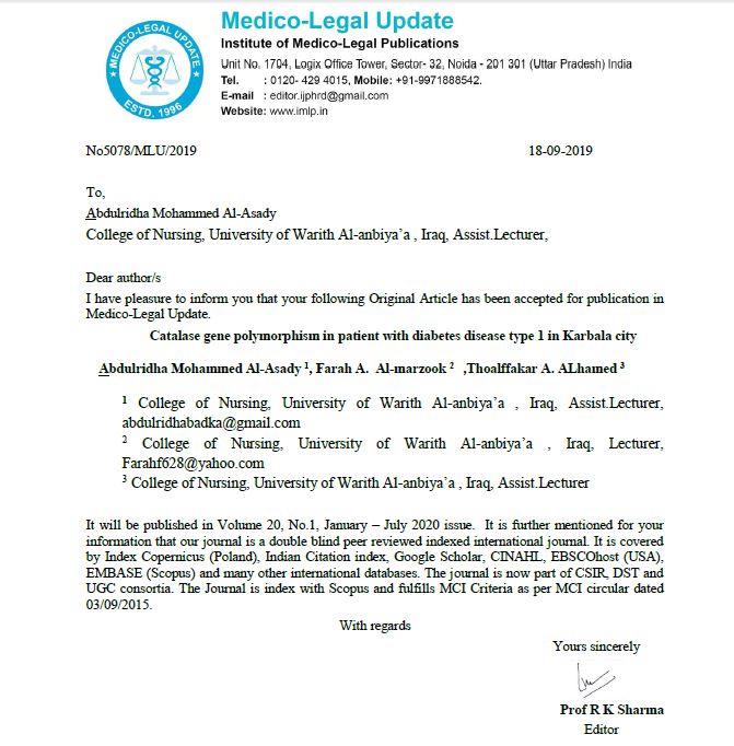 ‏Medico-Legal Update) العالمية والمصنفة ضمن مستوعبات سكوبس (8 H Index) ، وعن موضوع البحث تحدث م.م.عبد الرضا الأسدي قائلاً: