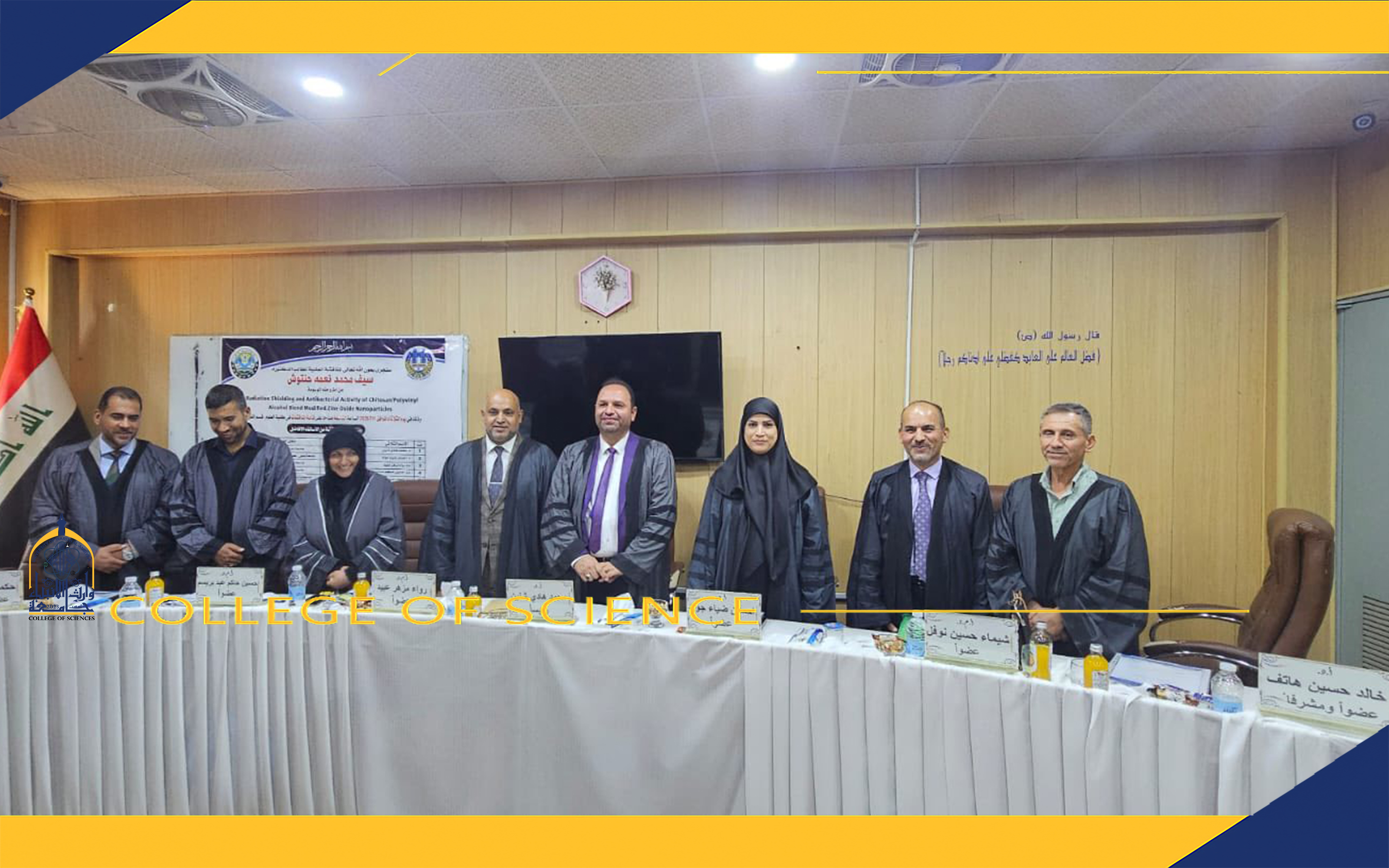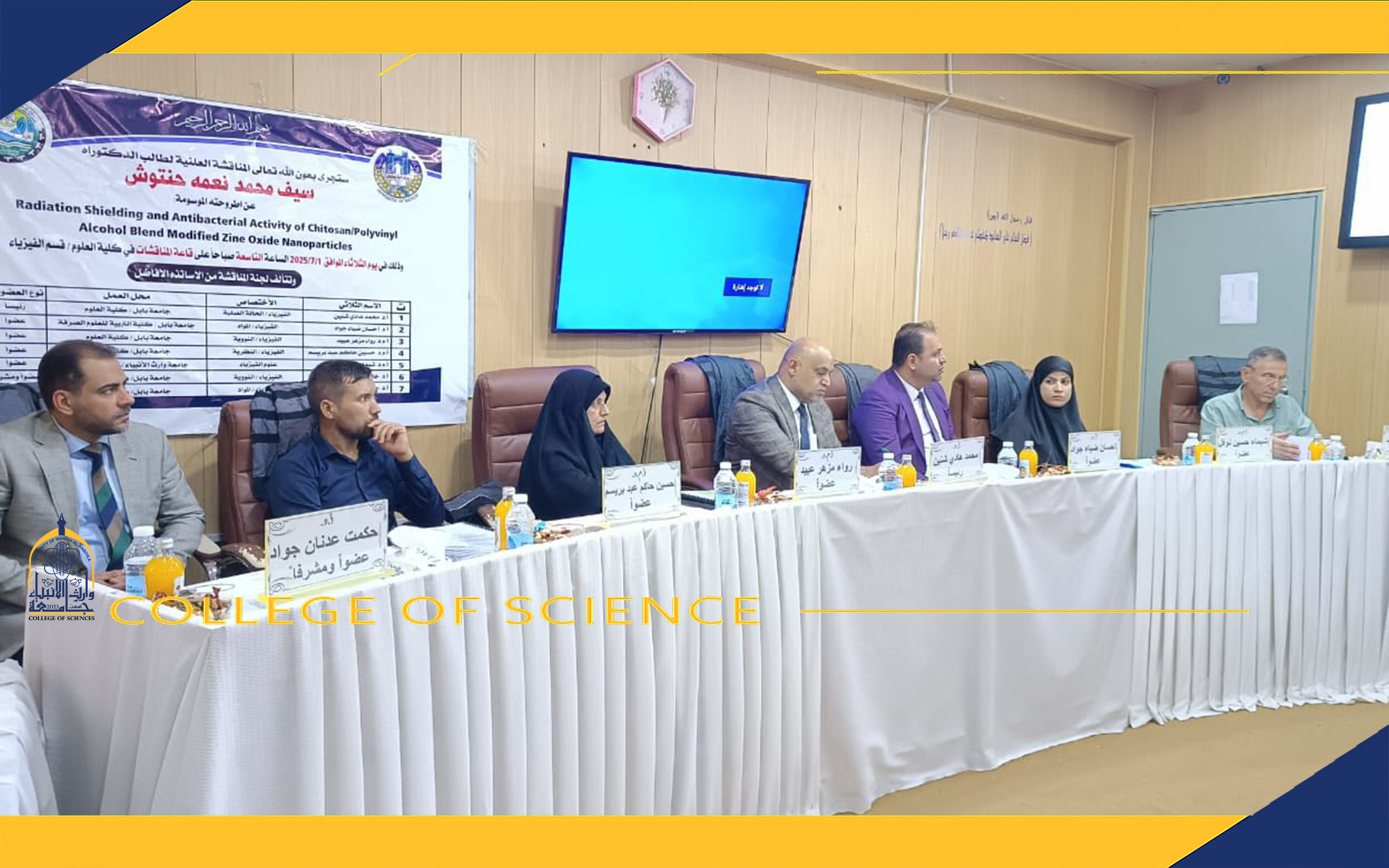 شاركت الأستاذ المساعد الدكتورة شيماء حسين نوفل، عميد كلية العلوم في جامعة وارث الأنبياء، ضمن لجنة مناقشة أطروحة دكتوراه في الفيزياء للطالب سيف محمد نعمه حنتوش، والتي أُجريت في كلية العلوم بجامعة بابل – قسم علوم الفيزياء.