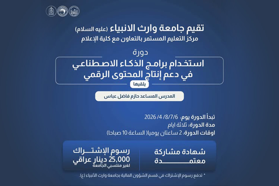 تعلن جامعة وارث الأنبياء عن إقامة دورة تدريبية في دعم إنتاج المحتوى الرقمي