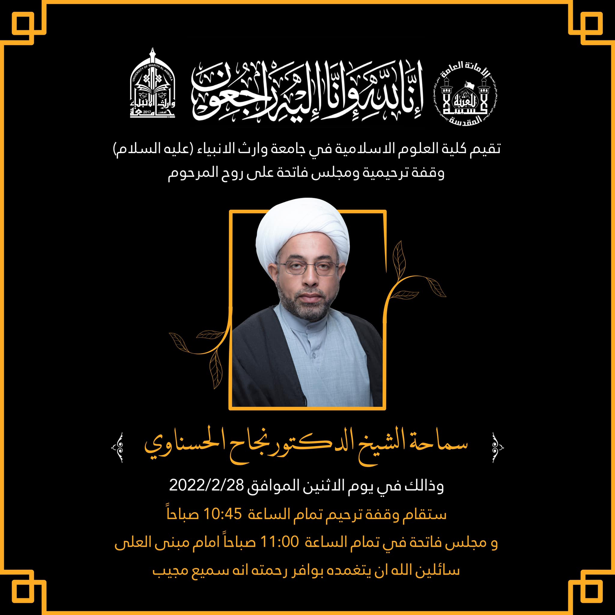 تقيم كلية العلوم الاسلامية في جامعة وارث الأنبياء (عليه السلام) مجلس تأبيني لسماحة الشيخ الدكتور نجاح الحسناوي، في تمام الساعة الحادية عشرة من صباح اليوم الاثنين 28-2-2022 سائلين العلي القدير أن يتغمده بواسع رحمته إنه سميع مجيب.