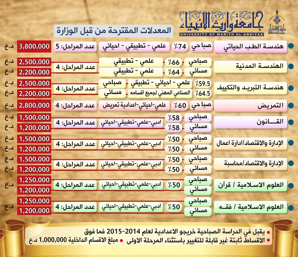 خفضت وزارة التعليم العالي والبحث العلمي العلمي الحدود الدنيا للقبول في الكليات والجامعات الأهليّة وأصبحت المعدلات المقبولة في جامعة وارث الانبياء (ع) كما يأتي :١- هندسة الطب الحياتي(علمي احيائي تطبيقي) ٧١.٥٢-هندسة مدني (علمي-تطبيقي)صباحي ٦٣.٥ والمسائي ٦١.٥٣-هندسة تقنيات التكييف والتبريد الصباحي والمسائي (للعلمي الاحيائي والتطبيقي )٥٩.٥اما بلنسبة للصناعة ٦٢.٥ للدراستين الصباحيةوالمسائية٤-التمريض (علمي احيائي اعدادية تمريض)٥٩.٥ ٥- القانون (علمي ادبي احيائي تطبيقي)الصباحي والمسائي ٥٦.٥٦- الادارة والاقتصاد -#المحاسبة و #ادارة الاعمال ( علمي ادبي احيائي تطبيقي تجارة عامة تجارة محاسبة تجارة ادارة اعمال ) للدراستين الصباحي والمسائي ٥٠٧- العلوم الاسلامية (القران والفقة واصولة ) علمي ادبي احيائي تطبيقي مهني اسلامي ٥٠٪؜