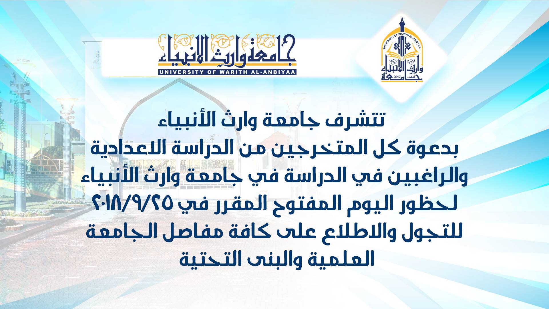 #جامعة_وارث_الأنبياء التابعة للعتبة الحسينية المقدسة ترحب بطلبتها الأعزاء الراغبين بالتسجيل في الجامعة أعزائنا طلبة السادس الإعداديسارعوا بالحصول على مقعد دراسي في جامعة وارث الأنبياء في كلياتها وأقسامها علما ان مدة التقديم ١٠ ايام فقط: ١.كلية الهندسه بأقسامها:-قسم الهندسة المدني -قسم هندسة طب الحَيَاة -هندسة تقنيات التبريد والتكييف ٢.كلية التمريض ٣.القانون ٤.كلية الادارة والأقتصاد -قسم ادارة الاعمال  -قسم المحاسبة ٥.كلية العلوم الإسلامية -قسم علوم القران -قسم الفقه وأصوله