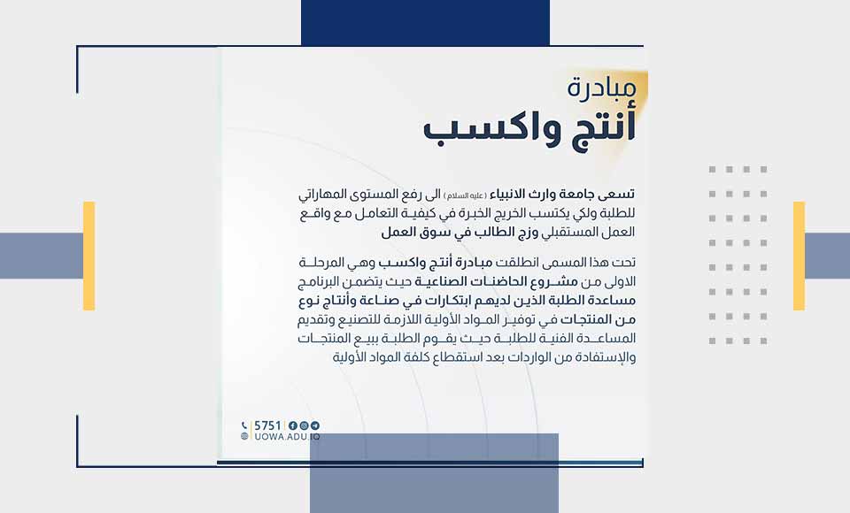 أطلقت جامعة وارث الأنبياء (عليه السلام) مبادرة (أنتج واكسب) ضمن مشروع الحاضنات الصناعية، بهدف تمكين الطلبة من تحويل أفكارهم إلى منتجات قابلة للتسويق، مع توفير المواد الأولية والدعم الفني واللوجستي  كما تُتيح للطلبة فرصة تسويق منتجاتهم والاستفادة من عوائدها المادية، مما يسهم في تنمية مهاراتهم العملية وبناء قدراتهم الريادية.    وتنسجم هذه المبادرة مع رؤية الجامعة في إعداد جيل مبتكر قادر على الإسهام بفعالية في دعم الاقتصاد الوطني وتحقيق التنمية الصناعية المستدامة في العراق.