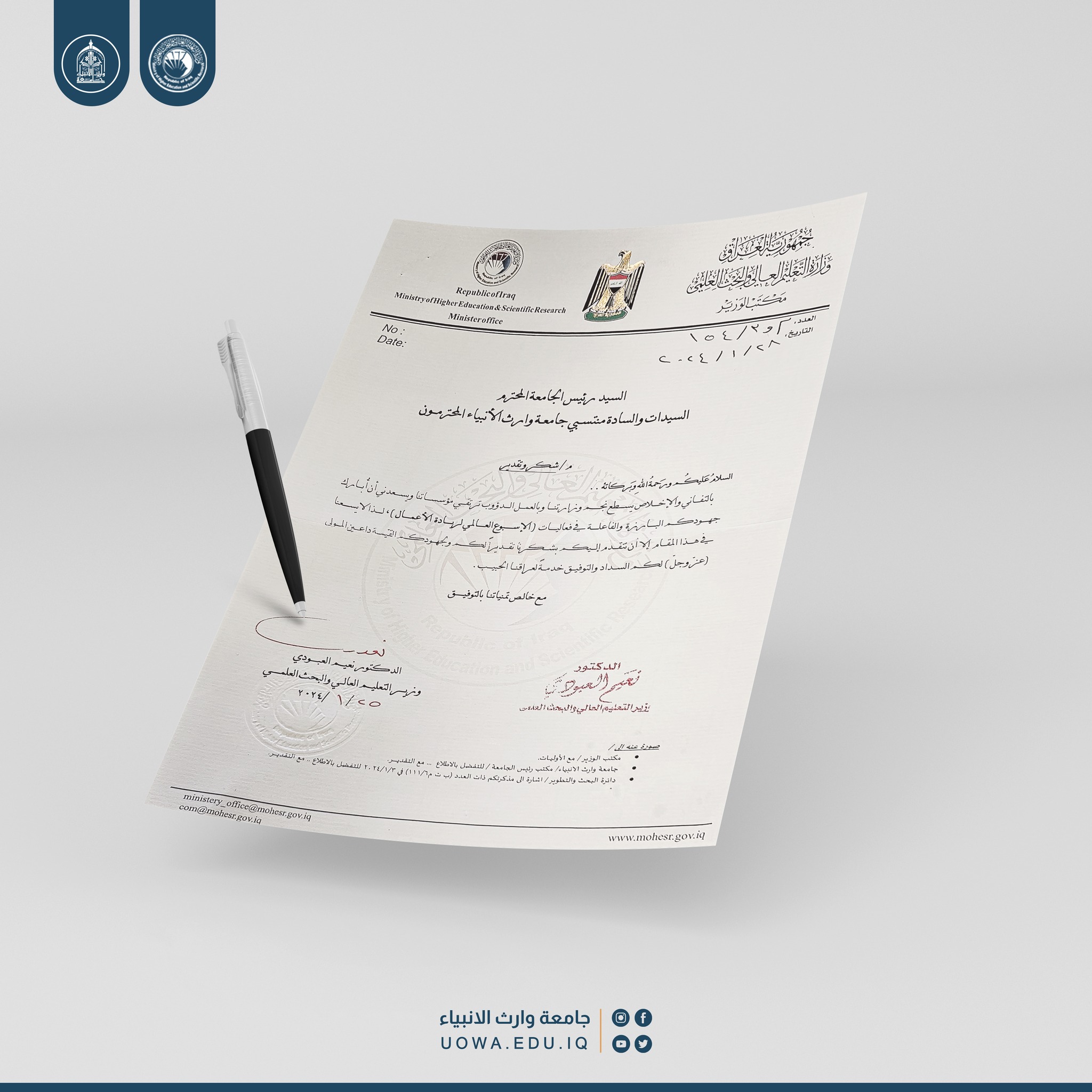 قدّم وزير التعليم العالي والبحث العلمي، الدكتور نعيم العبودي، "كتاب شكر وتقدير" إلى رئاسة جامعة وارث الأنبياء (عليه السلام)، تقديرًا للجهود المبذولة في دعم فعاليات الأسبوع العالمي لريادة الأعمال.