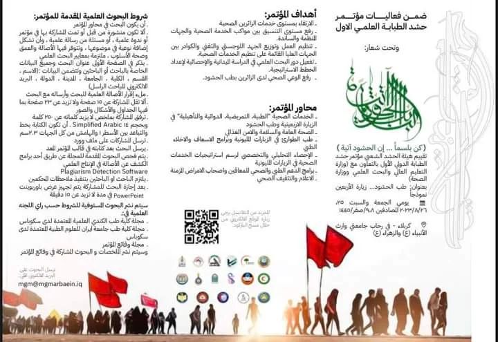 وتحت شعار "طب الحشود زيارة الأربعين انموذجاً" وذلك يومي الجمعة والسبت المصادف 25\26\8\2023 في رحاب جامعتي وارث الانبياء(عليه السلام) والزهراء(عليها السلام) للبنات, علماً أن آخر موعد لتسليم البحوث هو يوم 10\8\2023