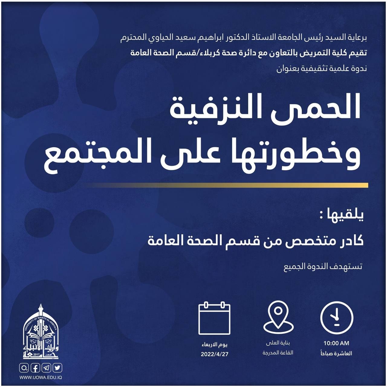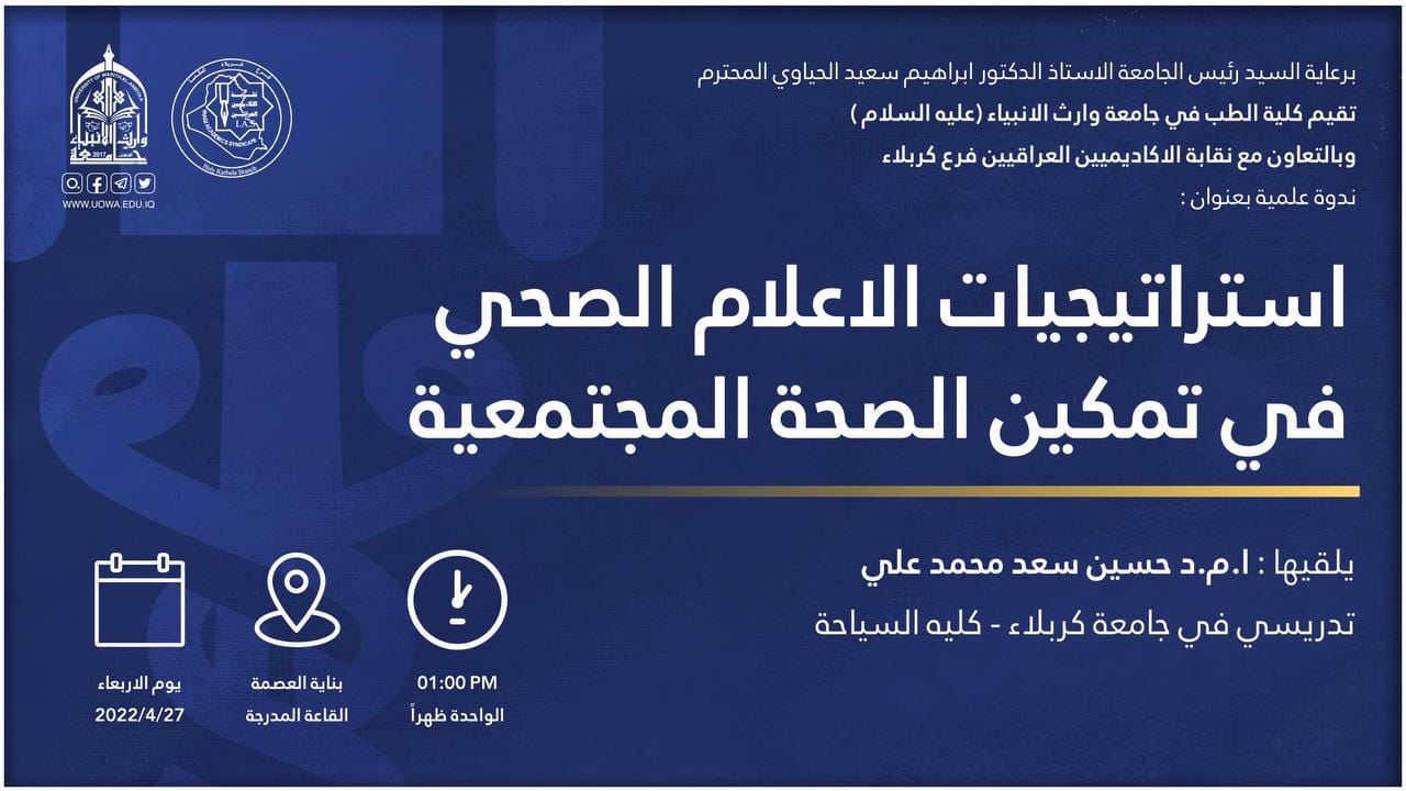 برعاية رئيس الجامعة الاستاذ الدكتور ابراهيم الحياوي تقيم كلية الطب وبالتعاون مع نقابة الاكاديميين العراقيين فرع كربلاء ندوة علمية بعنوان"استراتيجيات الاعلام الصحي في تمكين الصحة المجتمعية "