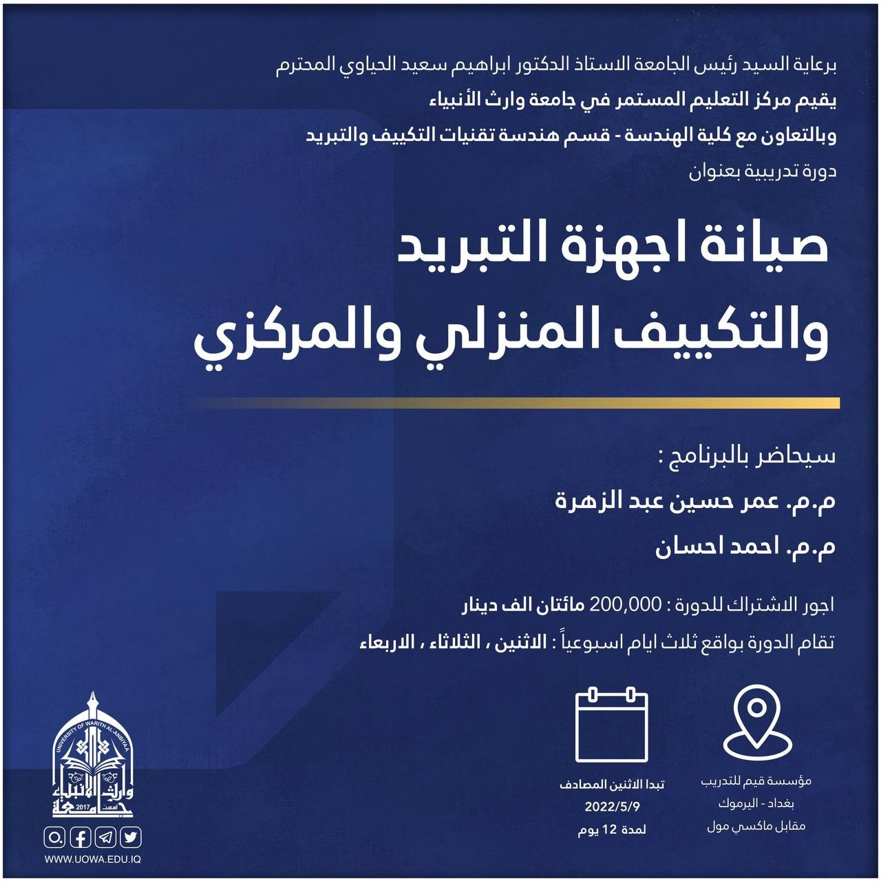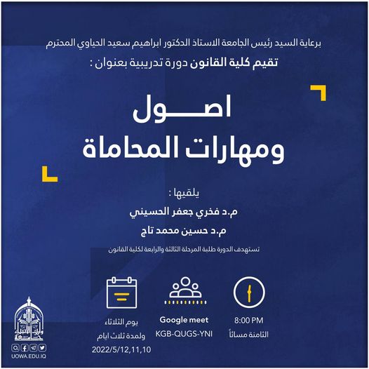 تستمر الدورة لمدة ثلاثة أيام ابتداءً من الاحد (15-16-17 /5/ 2022) على القاعة المدرجة في بناية العلا