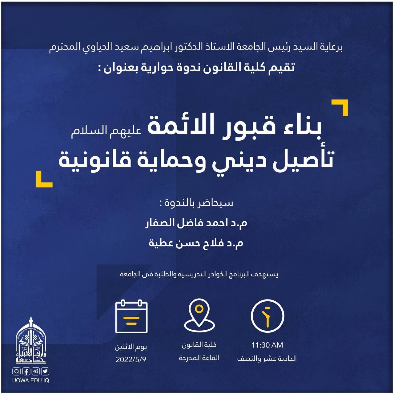 برعاية رئيس الجامعة الاستاذ الدكتور ابراهيم الحياوي تقيم كلية القانون ندوة حوارية بعنوان "بناء قبور الأئمة عليهم السلام تأصيل ديني وحماية قانونية"